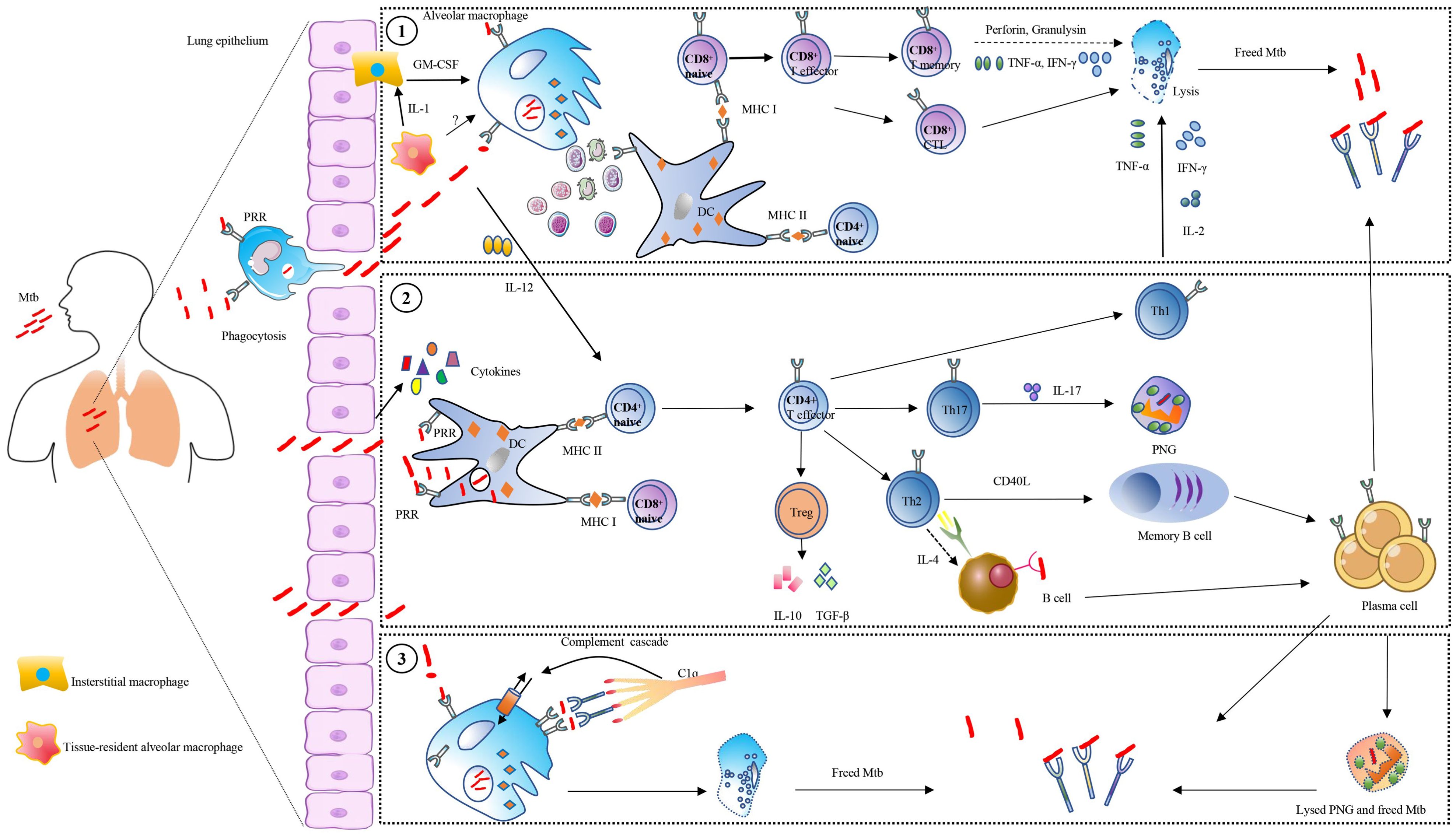 Figure 2. Overview of antibodies’ roles in tuberculosis. Control of Mycobacterium tuberculosis (Mtb) is the result of multiple immune cell interactions, such as T-cell, B-cell, macrophages, and dendritic cells (DC). Meanwhile, a variety of receptors and cytokines also mediated the process. The Mtb is internalized into macrophage and DC via pattern recognition receptors (PRR), and survives inside the phagosomal compartment, after which the apoptosis bodies carrying mycobacterial peptides are released. Several ways are employed by host cells to control Mtb: (1), These vesicles are acquired by DC, and the mycobacterial peptides are loaded on the MHC class I or MHC class II, which is presented to CD4+ T cells or CD8+ T cells. The CD8 T cells combined with MHC class I are activated, and act as cytolytic T lymphocytes (CTL) secreting perforin and granulysin to lyse host cells and kill Mtb. Moreover, the CD4+ T-helper (Th) cells combined with MHC class II are activated and polarized into different subsets including Th1, Th2, Th17, and Treg. Among them, Th1 cells can produce IL-2, TNF-α, and IFN-γ for interacting with macrophages. Th2 cells produce IL-4 to mediate B cells. Regulate T cells (Treg) produce IL-10 or transforming growth factor β (TGF-β). Th17 cells produce IL-17, which can activate polymorphonuclear granulocytes (PNG). (2), The Mtb is directly taken up by DC and is loaded on the MHC class I or MHC class II, with serial cells mediating as described above. (3) The affinity of antibody Fc domain with complement component 1 (C1q) causes complement-dependent cytotoxicity (CDC), which regulates host cells to eradicate Mtb. The lysed cells release Mtb which is affected by antibodies during cell-to-cell transfer.