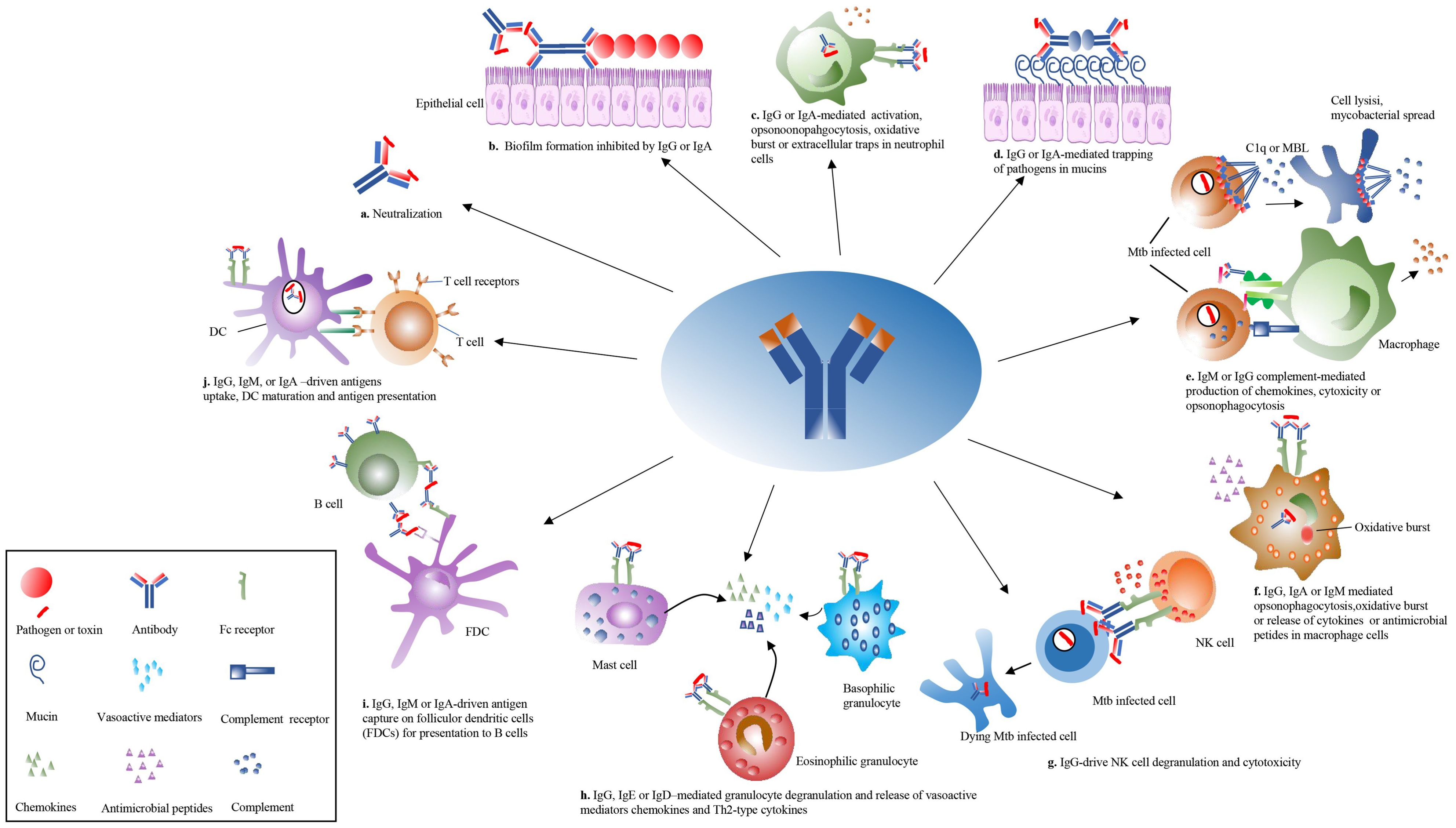 Figure 3. Overview of the antibodies’ effector functions. The antibody can play pleiotropic effectors functions during Mtb infection. (a) The antibody is directly neutralized with Mtb. (b) The antibody isotypes, IgG and IgA, inhibited biofilm formation. (c) The IgG and IgA activate neutrophil opsonophagocytosis, oxidative bursts, and extracellular traps. (d) The antibody isotypes, IgG and IgA, mediated the trapping of Mtb in mucins. (e) The IgM and IgG activate complement cascade to induce cell lysis through the membrane attack complex or drive Mtb clearance. (f) The IgG, IgM, and IgA mediate opsonophagocytosis, oxidative burst, or release of cytokines in macrophage cells. (g) The IgG isotypes drive natural killer (NK) cell degranulation to kill infected cells. (h) The IgG, IgE, and IgD mediate the degranulation of mast cells, eosinophilic granulocytes, and basophilic granulocytes to release vasoactive substances and cytokines in allergens or parasitic infections. (i) The follicular dendritic cells (FDCs) present mycobacterial antigen to B cells. (j) The IgG, IgM, and IgA mediate DC to enhance antigen uptake, processing, and presentation toward T cells. MBL, mannose-binding lectin.