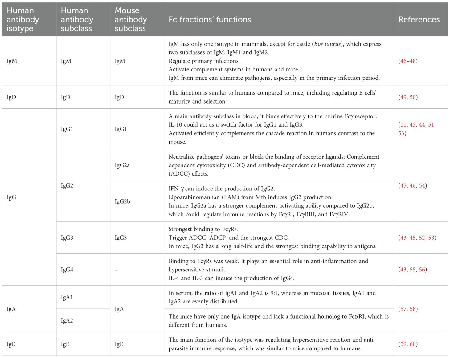 In addition to this, each antibody is further subdivided into several different subclasses based on the amino acid composition of the hinge region and the number and location of disulfide bonds (41). In mammals, there is only one type of IgM except for cattle (Bos taurus), which has two Igμ genes on the same chromosome and expresses two subclasses of IgM, IgM1 and IgM2 (42). Human IgG can be classified as IgG1, IgG2, IgG3, and IgG4, while mouse IgG is classified as IgG1, IgG2a/c, IgG2b, and IgG3. IgG1 is also the most promising subclass for tumor immunotherapy, and because human IgG1 is also able to bind effectively to the murine Fcγ receptor, significant effects can be observed in an in vivo mouse model (11, 43, 44) (Figure 1). IgG2 is mainly used to neutralize pathogen toxins or block the binding of receptor ligands, and its measured complement-dependent cytotoxicity (CDC) and antibody-dependent cell-mediated cytotoxicity (ADCC) effects have been shown to be very weak (45) (Table 1). IgG3 has the strongest binding capacity to FcγRs, triggers ADCC and antibody-dependent cell-mediated phagocytosis (ADCP), and has a stronger CDC effect than IgG1 (43–45) (Table 1). The hinge region of the IgG4 molecule is short, and its binding to FcγRs was weak (43, 55) (Figure 1). In humans, there are two subclasses of IgA, IgA1 and IgA2. Circulating monomeric immunoglobulin A (mIgA) and dimeric secretory IgA (sIgA) are two structures of IgA antibodies. Monomeric IgA is mostly IgA1 in the bloodstream and has functions as systemic immunity, while dimeric sIgA is the principal antibody of external secretions and the mucosal immune system (42). The differences between IgA1 and IgA2 are mainly in the structure of their hinge region and the number of glycosylation sites (57). In serum, the ratio of IgA1 and IgA2 is 9:1, whereas in mucosal tissues, IgA1 and IgA2 are evenly distributed. By contrast, mice have only one IgA isotype and lack a functional homolog to FcαRI, which is different from human beings (57) (Table 1). The studies indicate that IgA effector functions depend on subclass and glycosylation, and the balance of subclass distribution and IgA1/IgA2 ratio is associated with host immune responses and disease progression (58), and the mechanisms of these need to be further investigated.