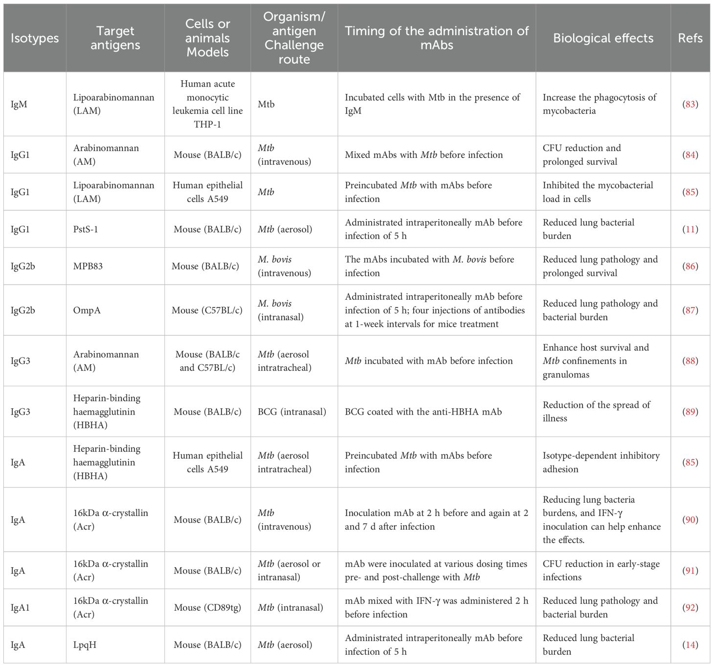 Tuberculosis is a contagious respiratory disease due to Mtb infection and is one of the top 10 single pathogens in the world in terms of mortality (163, 164). The problem of antibiotic therapy for tuberculosis has led to the emergence of Mtb drug resistance. In recent years, passive therapy with antibodies has become increasingly popular for research as an alternative to antimicrobial therapeutic agents. The effectiveness of various antibodies relies mostly on isotypes, which allows them to efficiently adapt to the most appropriate mode of transport across the epithelium to the site of function. Additionally, crucial research tools include broadly and powerfully antibodies, which may be used to find protective epitopes that can be developed into functional vaccines by structure-based reverse vaccinology. Currently, more than 70 monoclonal antibodies have been approved for the treatment of various pathogenic bacterial infections (165). However, many hurdles remain in the field of anti-infective mAbs: finding optimal targets for a pathogen, understanding how the isotypes, Fc receptors (FcRs), and other structural regions mediate protection, and developing better pre-clinical and clinical trials to investigate the therapeutic potential of these antibodies (165).