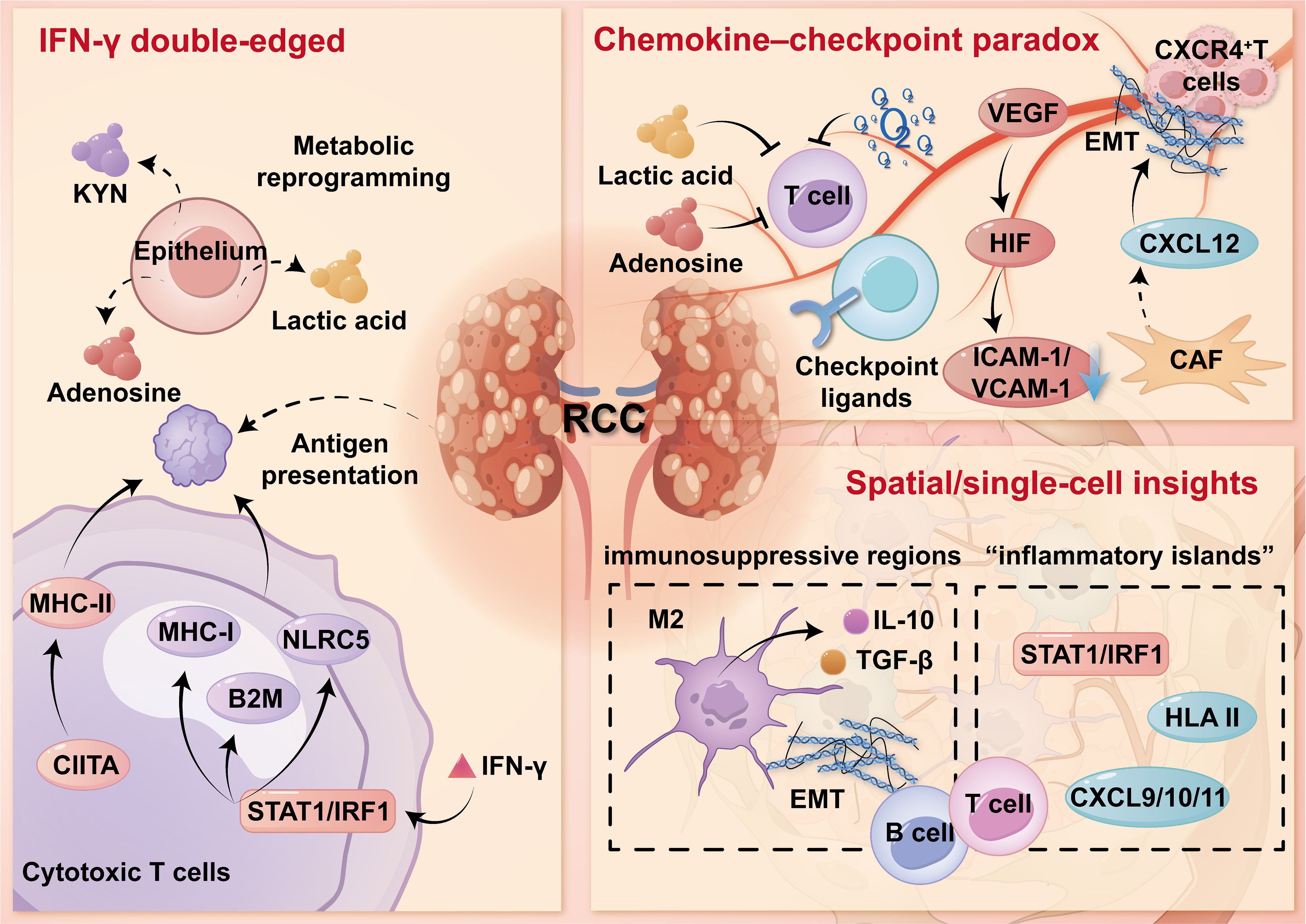 Renal cell carcinoma (RCC) accounts for the vast majority of kidney malignancies and remains one of the leading causes of death from genitourinary system cancers globally. Its incidence rate is influenced by the increased exposure to metabolic and vascular risk factors, as well as the widespread use of cross-sectional imaging (1, 2). From a biological perspective, RCC exhibits significant inter- and intratumoral heterogeneity. Clear cell RCC (ccRCC) is the predominant subtype, characterized by the loss of the VHL gene and activation of the HIF pathway. Equally decisive is the ability of RCC to remodel and exploit the tumor immune microenvironment (TIME): tumor cells, stromal cells, and endothelial cell populations jointly regulate cytokine and chemokine programs, thereby refining lymphocyte migration, antigen presentation, and effector functions, gradually driving the transition from immune surveillance to immune evasion. The resulting immune ecology includes: immune infiltration regions accompanied by interferon response programs; immune exclusion zones where lymphocytes are sequestered at the edge due to fibrovascular and stromal barriers; and immune deserts with almost no leukocyte presence. These phenotypes are closely correlated with the heterogeneity of clinical behavior and differential responses to combined treatment with immune checkpoint blockade (ICB) and VEGF targeting (3, 4).