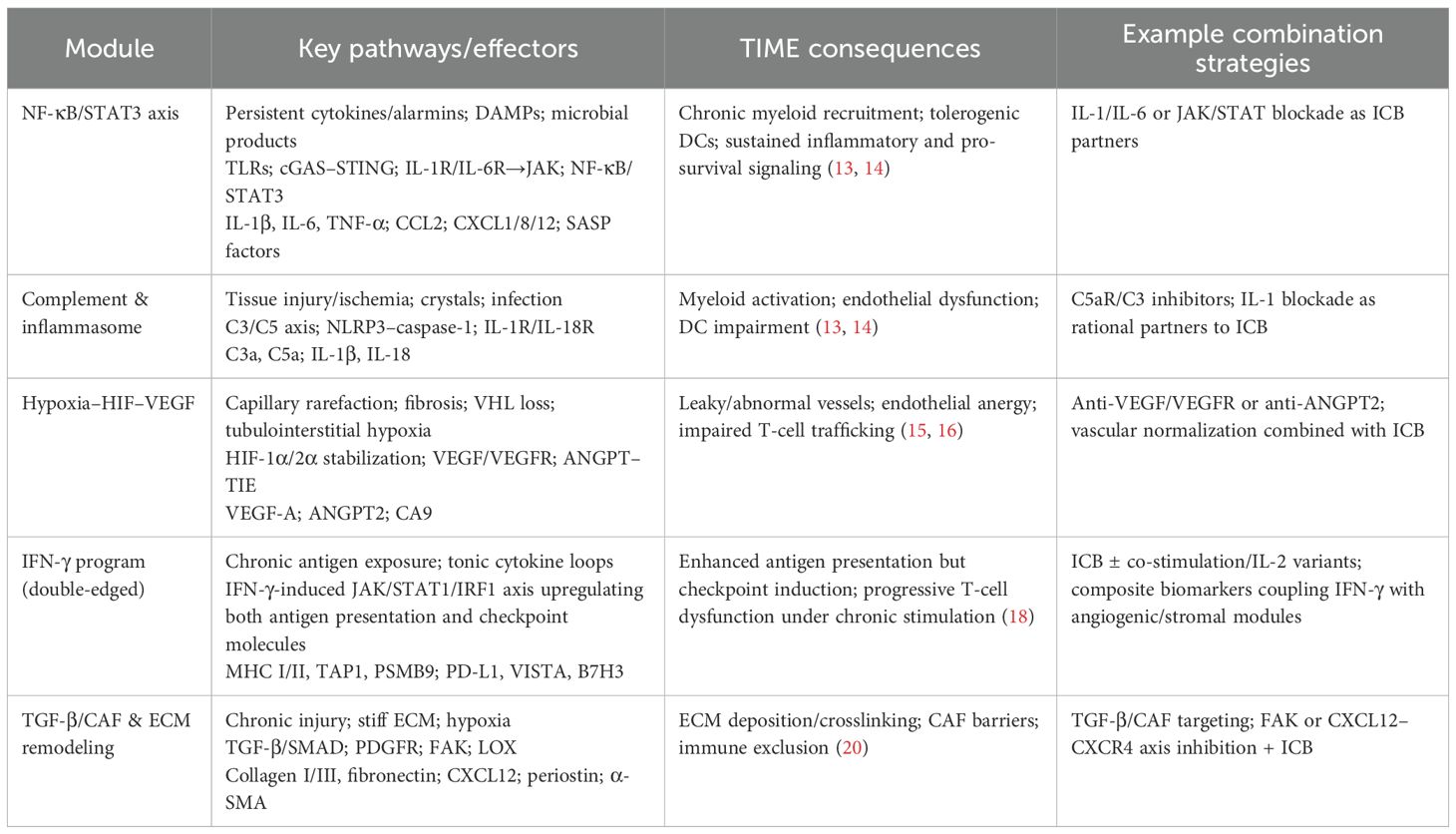Three interacting modules organize this transition and reinforce one another. First, innate sensors and alarmins sustain NF-κB/STAT3 signaling; complement and inflammasome pathways further amplify myeloid-biased inflammation and promote tolerogenic dendritic-cell states with low CCR7/CD86, limiting effective T-cell priming and egress (13, 14). Second, capillary rarefaction and fibrosis drive tubulointerstitial hypoxia, stabilizing HIF-1/2 and amplifying VEGF-dependent angiogenic programs that reshape vascular structure and trafficking cues (15–17). Third, IFN-γ signaling is a double-edged module: it enhances antigen-presentation machinery while concurrently inducing inhibitory checkpoints and fostering dysfunctional/exhausted T-cell states under chronic exposure (18, 19). In parallel, cancer-associated fibroblasts (CAFs) and activated endothelium remodel matrix and vasculature to limit lymphocyte access, consolidating an inflamed-yet-restrained program (20).