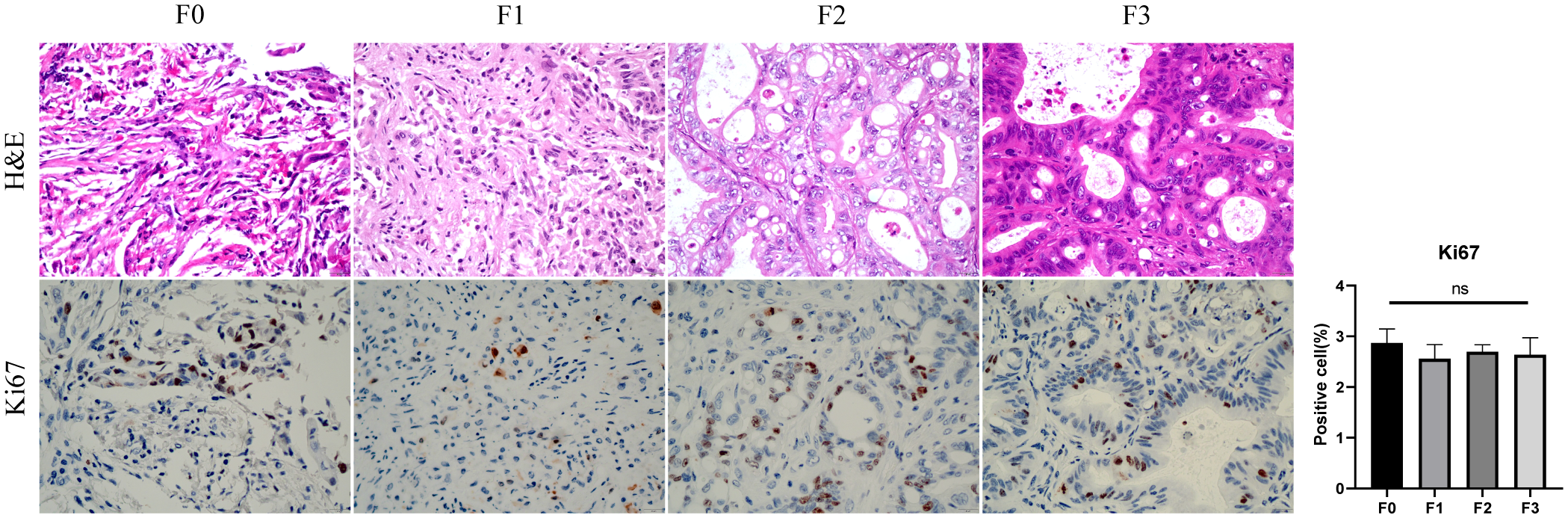 The comparison of HE and Ki67 between primary tumor(F0) and PDX(F1-3). F0, F1, F2 is poorly differentiated gastric adenocarcinoma, F3 is Moderate to poorly differentiated gastric adenocarcinoma, Ki67-positive cell (%) showed no difference between primary tumors and PDXs (ns, P > 0.05).