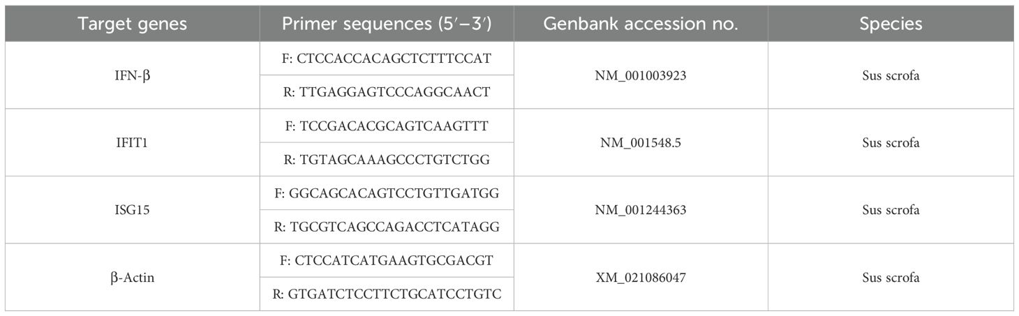 Total RNA was extracted with TRIzol reagent (Tiangen, DP424) after discarding the supernatant of the cell culture and washing the cells twice with PBS, then subjected to reverse transcription with HiScript III RT SuperMix for qPCR (Vazyme, R323-01). PCR were performed with ChamQ Universal SYBR qPCR Master Mix (Vazyme, Q711) using ABI QuantStudioTM 3 (Applied Biosystems, CA, The United States). Relative expressions of specific genes were calculated by 2−ΔΔCt method by normalizing to the house-keeping gene (β-actin) expression. Primers were indicated in Table 1 and synthesized by Sangon Biotech (Shanghai, Co, Ltd.).