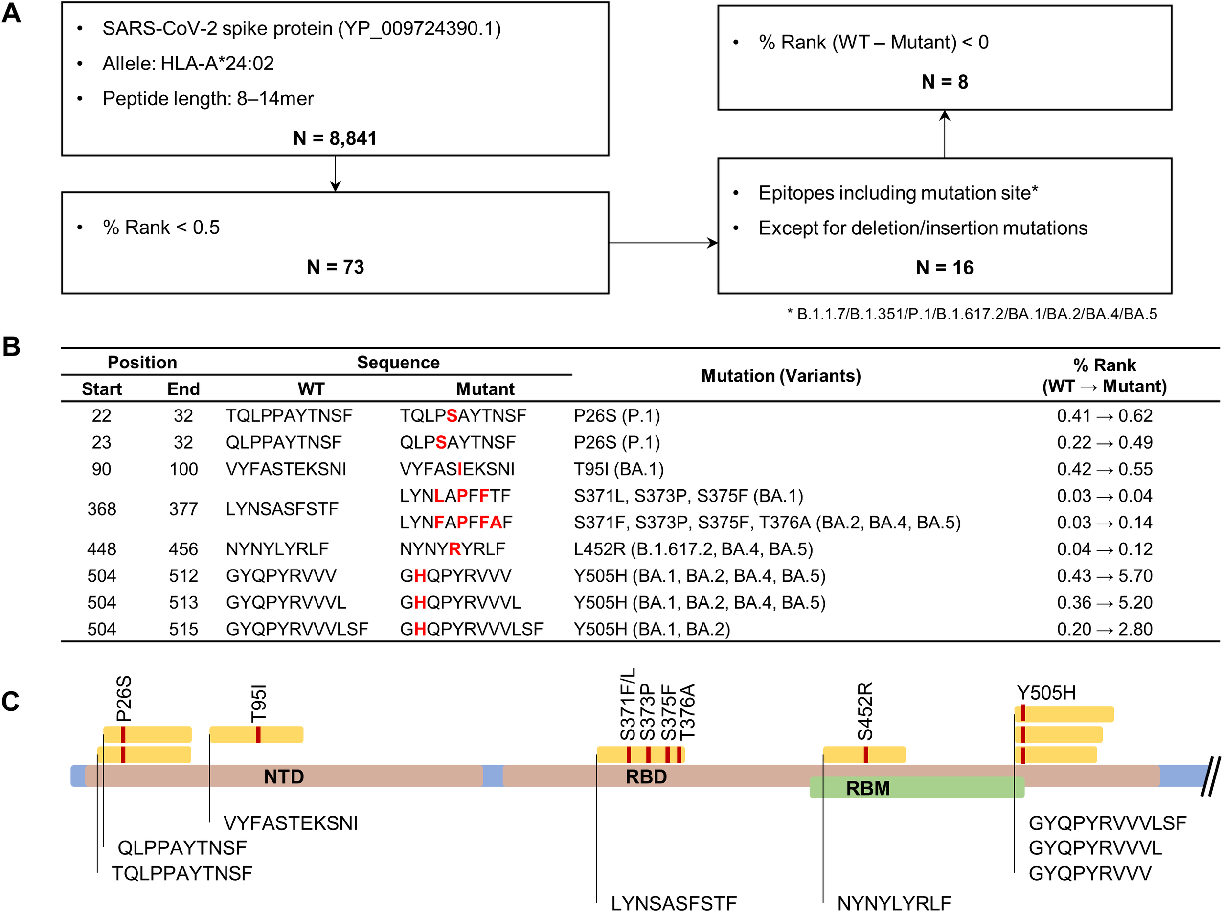Figure 2. Bioinformatic prediction of HLA-A*24:02-restricted spike epitopes containing variant-associated mutations. (A) Flowchart for HLA-A*24:02-restricted epitope prediction. The epitope candidates in the ancestral SARS-CoV-2 spike protein (accession number YP_009724390.1) were selected based on the binding affinity score (percentile rank value, % rank) to the HLA-A*24:02 allele using the NetMHCpan EL 4.1 tool. (B) Original and mutant sequences of final epitope candidates. Amino acid changes are marked in bold red. (C) Schematic diagram showing the locations of the predicted epitopes and their mutation sites in the spike protein.