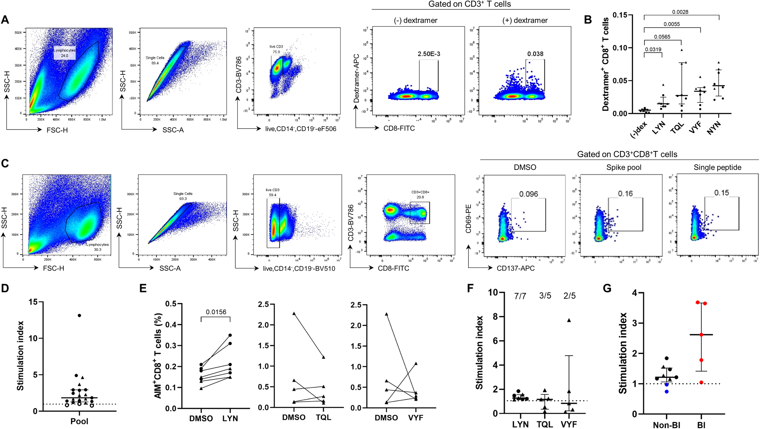Figure 3. Experimental validation of the HLA-A24-rstricted epitope inducing CTL responses in COVID-19 vaccine recipients. (A, B) Validation of epitope candidates by peptide-MHC dextramer staining in the T cell populations expanded from HLA-A*24:02-genotyped peripheral blood mononuclear cells (PBMCs). The frequency of peptide-specific dextramer+CD8+ T cells was measured in BNT162b2 (n = 2, •) or mRNA-1273 (n = 6, ▴) vaccine recipients. (A) is the representative flow cytometry plots for (B) (–)dex represents an FMO control in which all antibodies were included except for dextramer–APC. (C–F) The peptides LYN, TQL, and VYF were further examined by AIM assay in BNT162b2 (•) or mRNA-1273 (▴) vaccinated individuals. HLA-A*24:02-positive PBMCs were stimulated with wild-type peptide pool or the epitope candidate peptides, and the percentages of antigen-specific CD8+ T cells were analysed using CD69 and CD137 markers. (C) is the representative flow cytometry plots for (D, E). Stimulation indices calculated as fold change in activated T cell frequencies by each peptide relative to the dimethyl sulfoxide (DMSO)-treated negative control are presented (F). (G) Stimulation indices (SI) based on LYN-specific CD8+ T cell frequency were compared between HLA-matched (black) and –mismatched (blue) PBMC samples using AIM assay. Additionally, HLA-A*24:02-positive samples from vaccinated individuals who experience breakthrough infection (BI, red) were analysed. Exact P values are shown in comparison with the fluorescence minus one (FMO) control lacking dextramer-APC (B) or with DMSO-treated samples (E). SI were calculated as the fold change in activated T cell frequencies in response to each peptide relative to the DMSO-treated negative control. The dotted lines in (D, F, G) represent a SI value of 1 as a cut-off point. All values are expressed as the median and the error bar indicates the interquartile range in (D, F, G).
