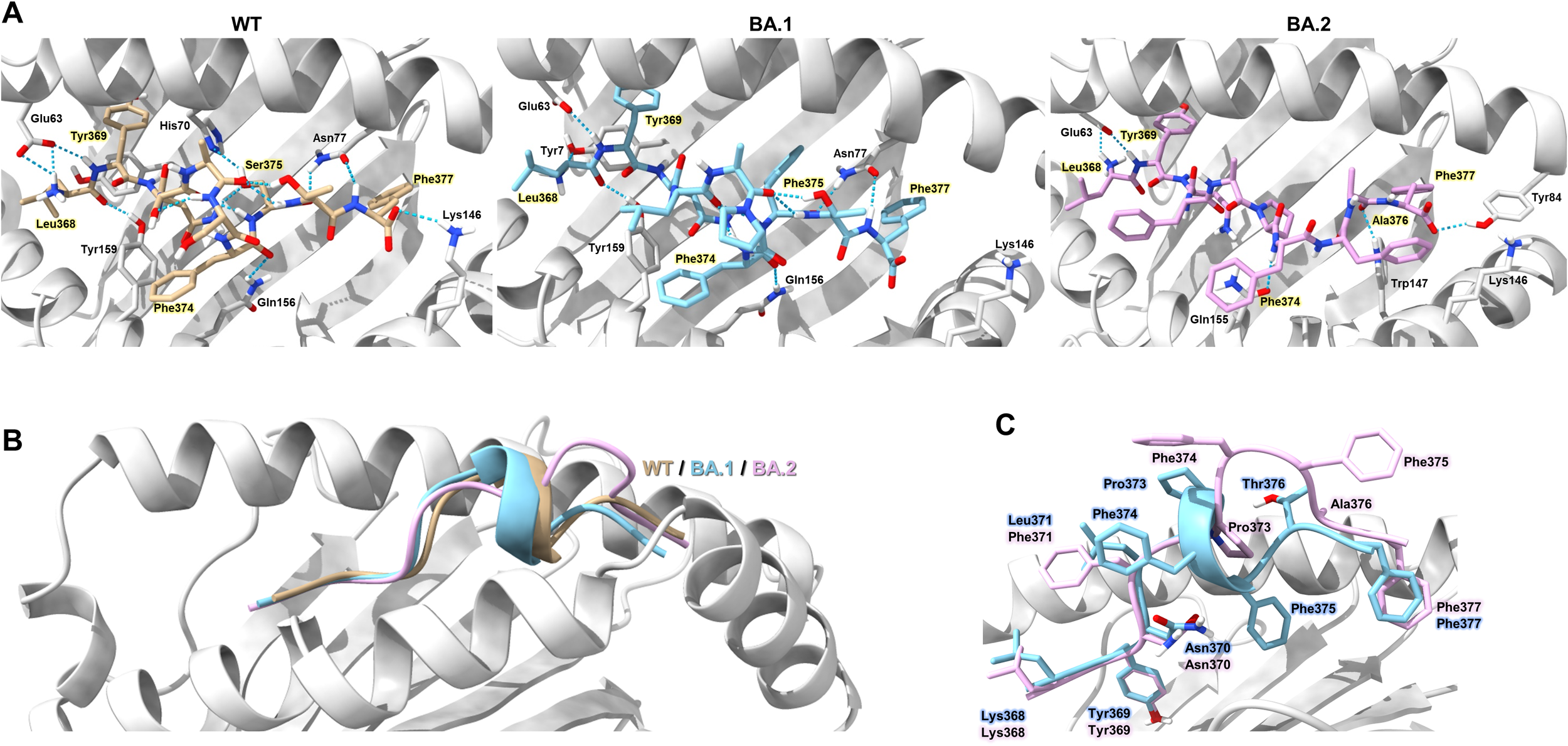 Figure 5. Structural model of HLA-A*24:02-LYN peptide complex based on docking simulation. (A) Overview of the structure model showing hydrogen bond interactions (blue dotted lines) between HLA-A*24:02 and the LYN epitope or its mutants. Individual peptides are coloured light brown (WT), sky blue (BA.1), and pink (BA.2). Hydrogen bond-forming residues of the HLA molecule that interact with peptide residues are annotated in the figure. Key peptide residues forming direct hydrogen bonds with the HLA binding groove are highlighted in yellow. (B) Structural differences among the WT and mutant peptides are illustrated as cartoon representations, with each peptide coloured according to the scheme in (A). (C) Comparison of C-terminal conformations in BA.1 and BA.2 peptides, with each residue colored sky blue (BA.1) or pink (BA.2).
