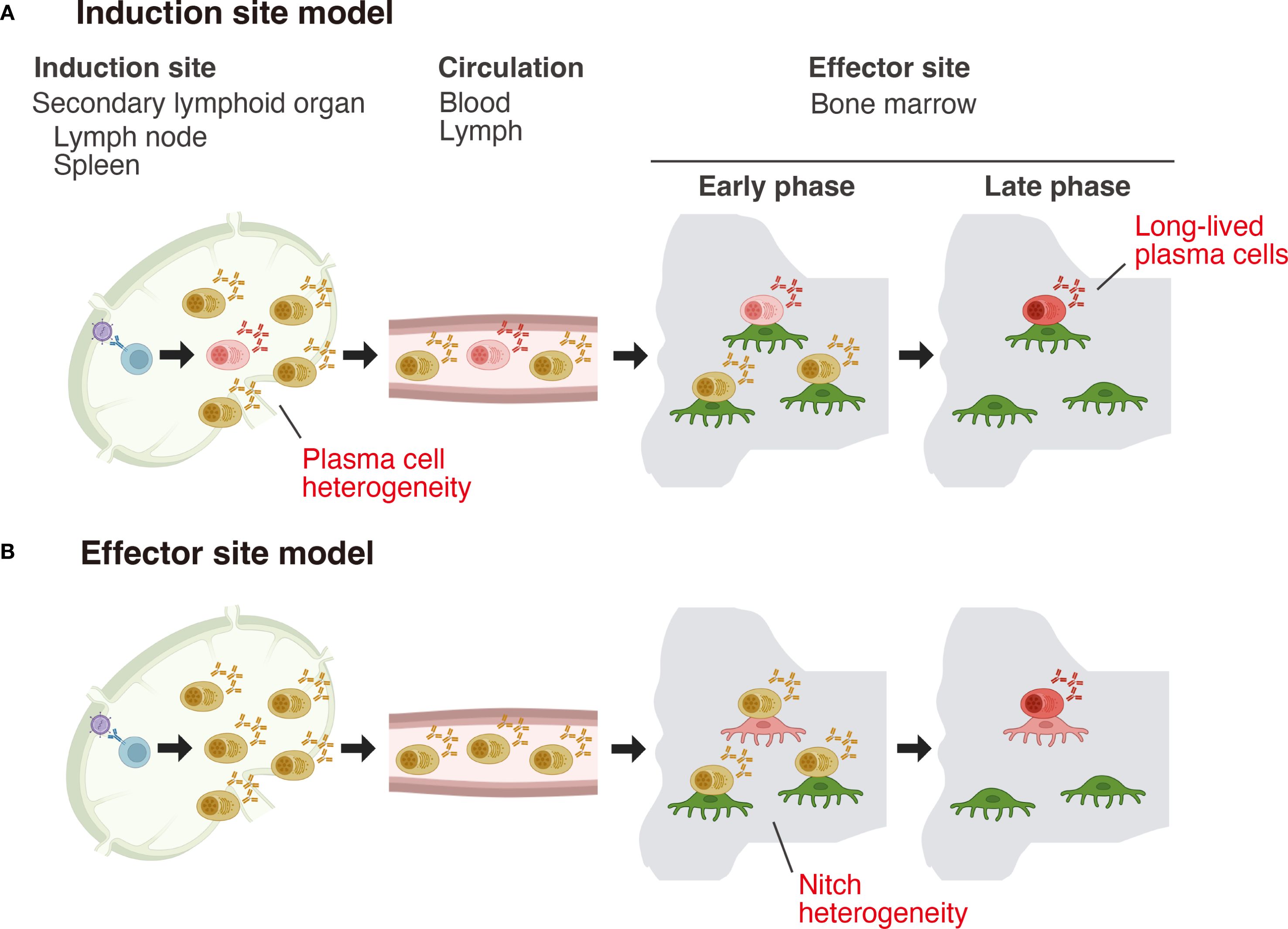 Figure 1. Two models for the acquisition of long-term survival capacity by plasma cells. (A) Induction site model: In this model, differences in plasma cell lifespan are programmed at the induction site, with the fate of becoming long-lived already imprinted at this stage. (B) Effector site model: In this model, plasma cells generated at the induction site are initially functionally uniform and stochastically migrate to the bone marrow. Within the bone marrow, a heterogeneous population of niche cells exists, and only plasma cells that interact with niche cells possessing high “nursing” capacity mature and acquire long-term survival potential.