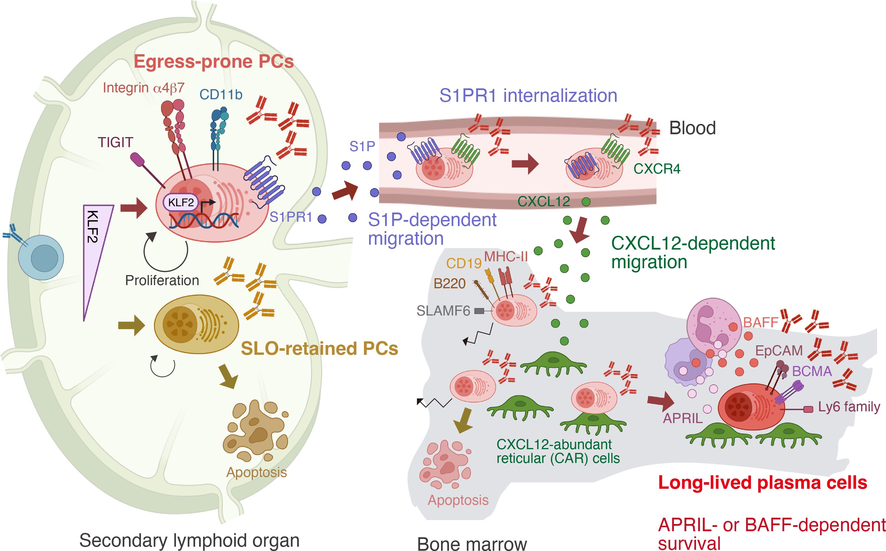 Figure 2. Stepwise differentiation toward long-lived plasma cells (LLPCs). In secondary lymphoid organs—the sites of plasma cell (PC) generation—PCs can be divided into two subsets based on expression of the transcription factor KLF2. Integrin β7lo TIGIT– PCs remain in the secondary lymphoid organs (SLOs), whereas Integrin β7hi TIGIT+ PCs acquire the capacity to migrate to the bone marrow. This migration is driven by KLF2-mediated upregulation of S1PR1, which senses the gradient of sphingosine-1-phosphate (S1P). Upon entering the bloodstream, where S1P levels are high, ligand engagement leads to internalization of S1PR1. These PCs then respond to the chemokine CXCL12, which is produced in the bone marrow, and migrate into the bone marrow. Only a fraction establish long-term residency and mature into LLPCs, which can be distinguished from recently arrived PCs by distinct surface marker expression. Within bone marrow niches, LLPCs are sessile and receive survival support from factors such as APRIL and BAFF produced by niche cells.