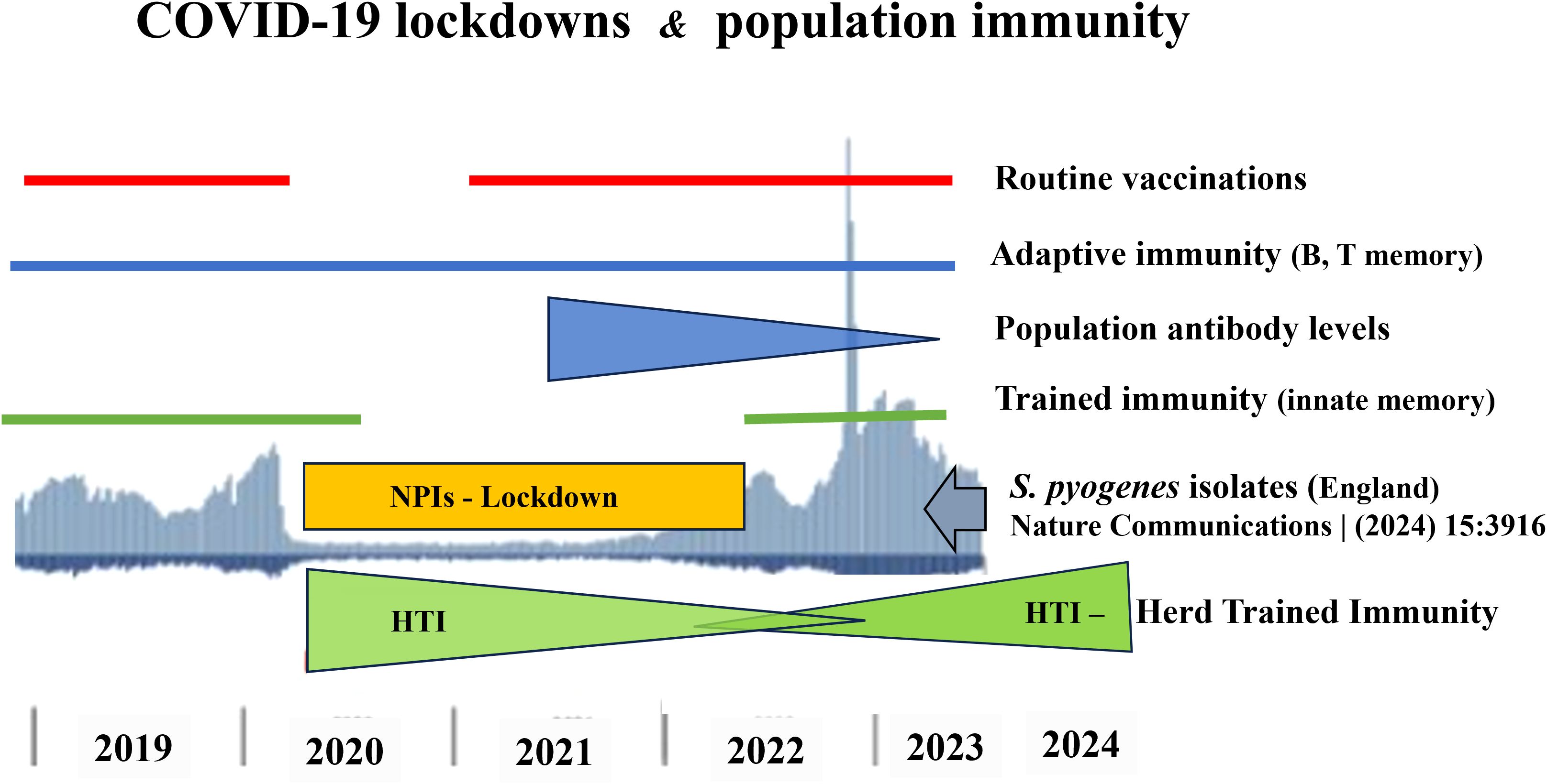 Finally, this hypothesis, which associates impaired Herd Trained Immunity (HTI) with the post-pandemic resurgence of GAS infections, does not exclude the contribution of additional factors or triggers. Notably, it indicates for the first time, that population-level of trained innate immunity exists and may be compromised by prolonged reduced contact with microbiota. However, it should be confirmed in the future by retrospective epidemiological studies covering pre- and post-pandemic few years. Nevertheless, the observed association between COVID-19 lockdown and impaired HTI suggests that future pandemic response strategies should, in addition to widespread vaccination, carefully balance the extent of lockdown measures with the preservation of HTI.