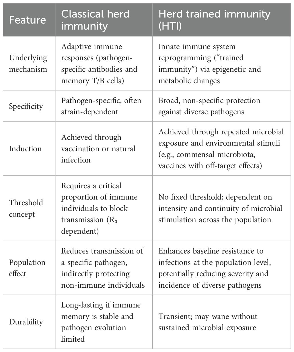 The concept of herd immunity traditionally refers to the protection of a population from infectious disease through widespread acquisition of antigen-specific adaptive immunity, particularly by memory B and T cells (48). In contrast, herd trained immunity (HTI) refers to the defense mechanisms conferred by the innate immune system, which operates through nonspecific memory and enhanced responsiveness to pathogens. Unlike adaptive immune memory, trained immunity involves cells such as monocytes and macrophages that have a much shorter lifespan—typically weeks to months (40). I have created with the assistance of AI, the comparison table between classical herd immunity and my concept of HTI to clarify their impact on infectious immunity at the populational level (Table 1).