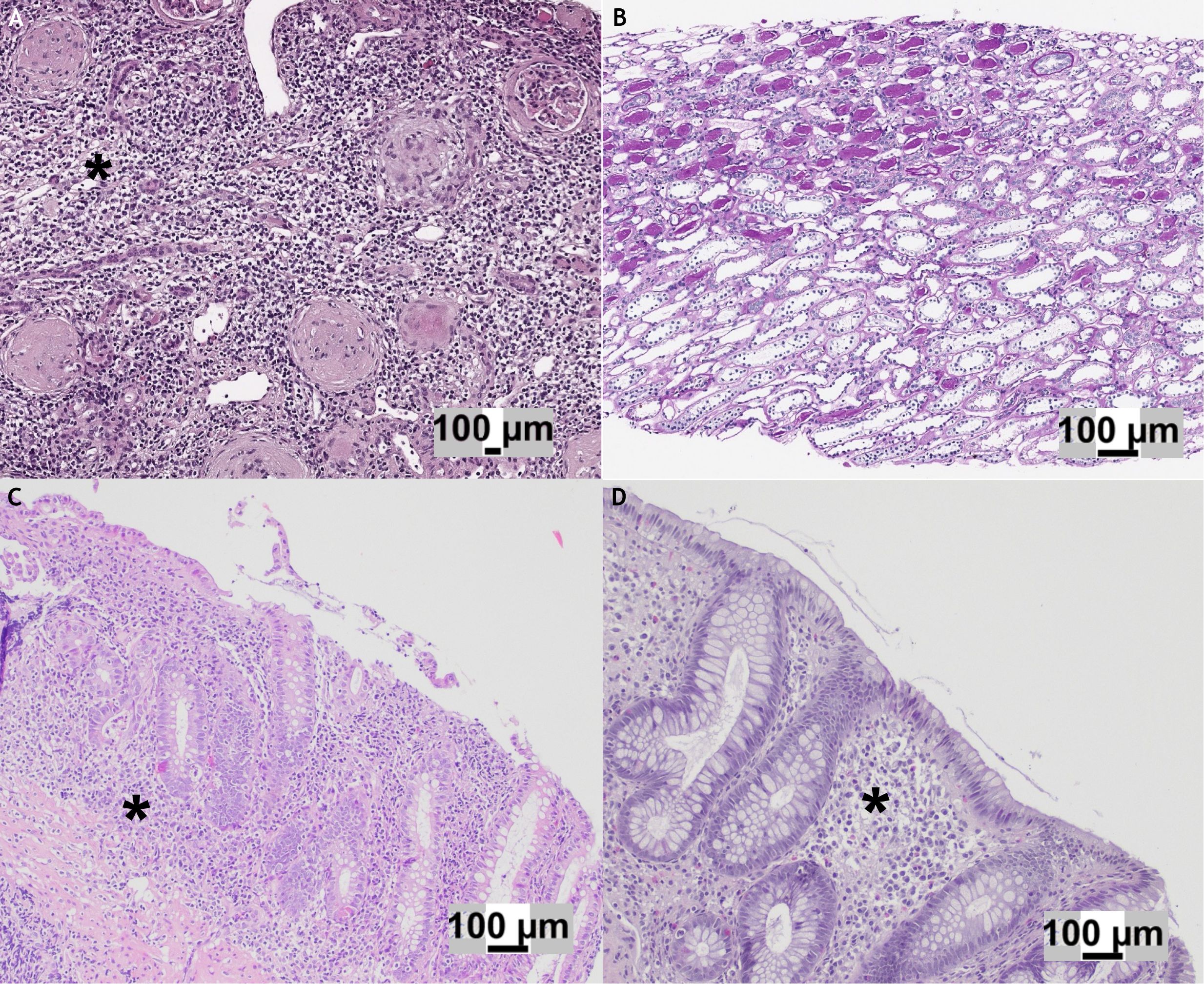 Figure 2. (A) Hematoxylin and eosin (H&E) stain of the initial kidney biopsy showing global glomerulosclerosis associated with an interstitial inflammatory infiltrate (*) predominantly composed of lymphocytes. (B) H&E stain of the follow-up kidney biopsy demonstrating mild tubular atrophy in the medullary compartment, with no evidence of active inflammation. (C) Gastrointestinal biopsy displaying an ulcerative colitis-like pattern, characterized by continuous, marked inflammatory infiltrate (*) with cryptitis and ulcerations. (D) Colon biopsy obtained at the time of kidney injury: in comparison with panel C, no active inflammation, cryptitis, or ulcerations were observed, although crypt architectural distortion was present..