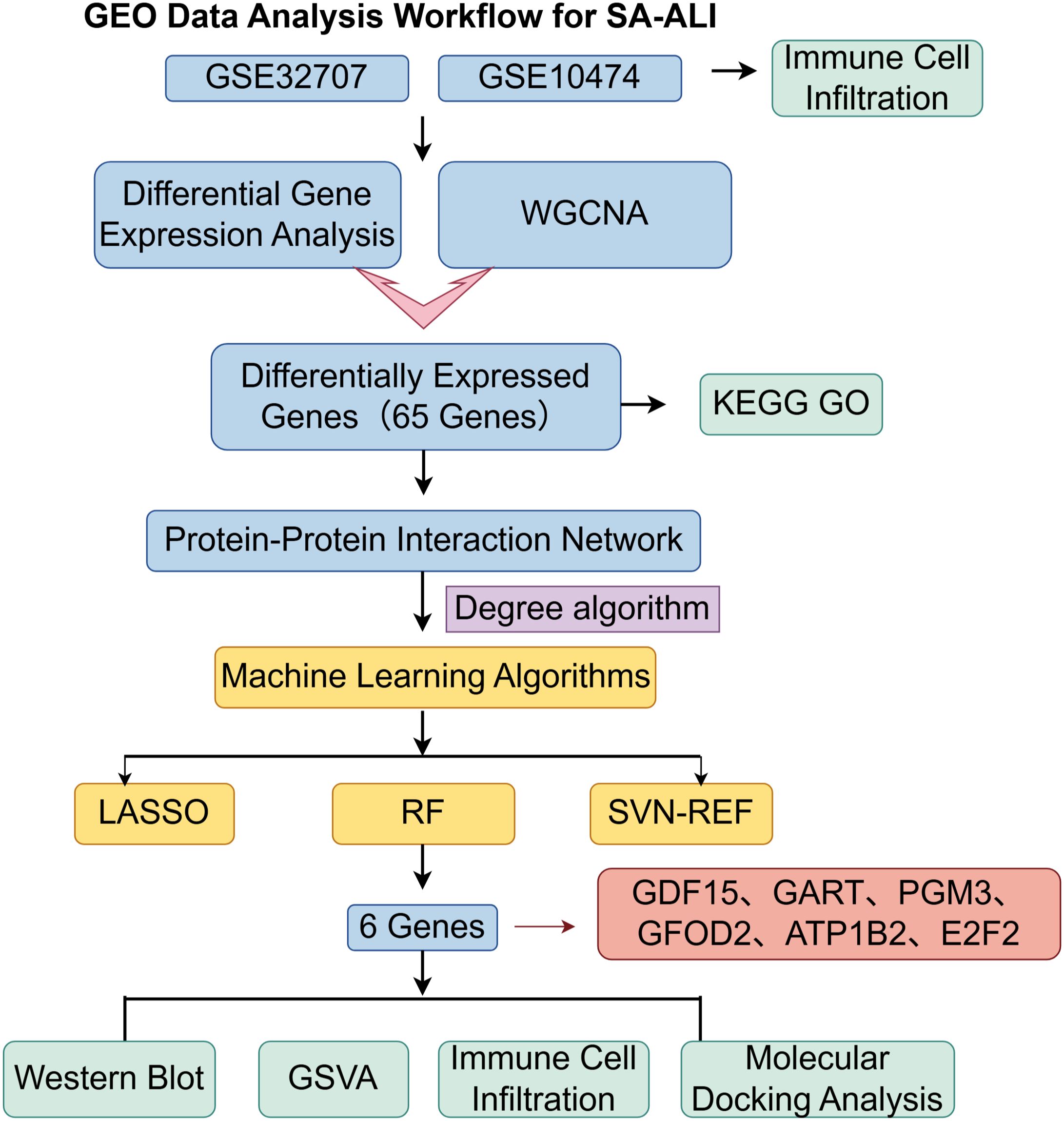 Workflow diagram titled “GEO Data Analysis Workflow for SA-ALI.” It starts with datasets GSE32707 and GSE10474, leading to Differential Gene Expression Analysis and WGCNA. It identifies 65 differentially expressed genes which are analyzed via Protein-Protein Interaction Network and Degree algorithm. Machine learning algorithms LASSO, RF, and SVN-REF select six genes: GDF15, GART, PGM3, GFOD2, ATP1B2, E2F2. These genes undergo further analysis: Western Blot, GSVA, Immune Cell Infiltration, and Molecular Docking Analysis. KEGG GO and Immune Cell Infiltration are also involved.