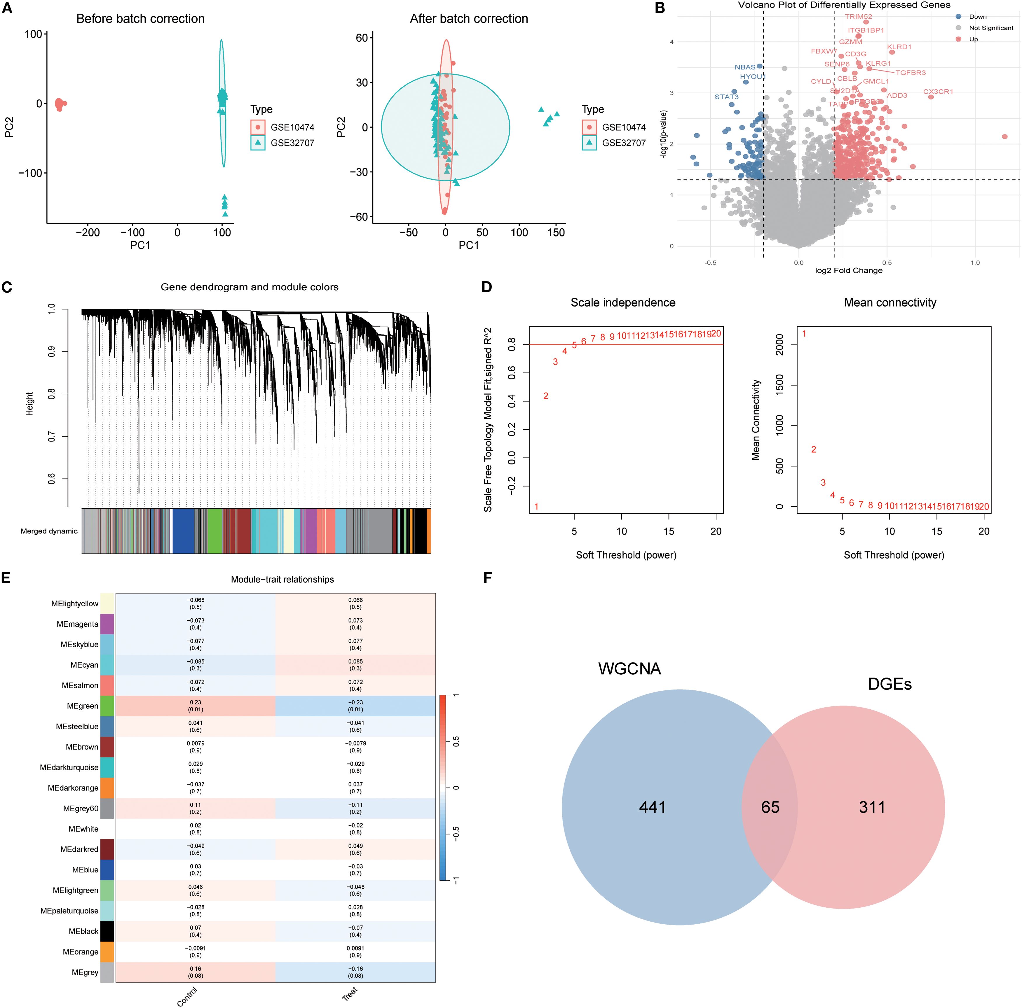 Panel of six statistical visuals. (A) Two scatter plots show data distribution before and after batch correction, distinguishing types. (B) Volcano plot of differentially expressed genes, highlighting significant changes. (C) Gene dendrogram with corresponding module colors. (D) Graphs of scale independence and mean connectivity related to soft threshold power. (E) Heatmap of module-trait relationships, displaying correlation values and colors. (F) Venn diagram showing overlap between WGCNA and differentially expressed genes, with 65 overlapping, 441 unique to WGCNA, and 311 unique to differentially expressed genes.