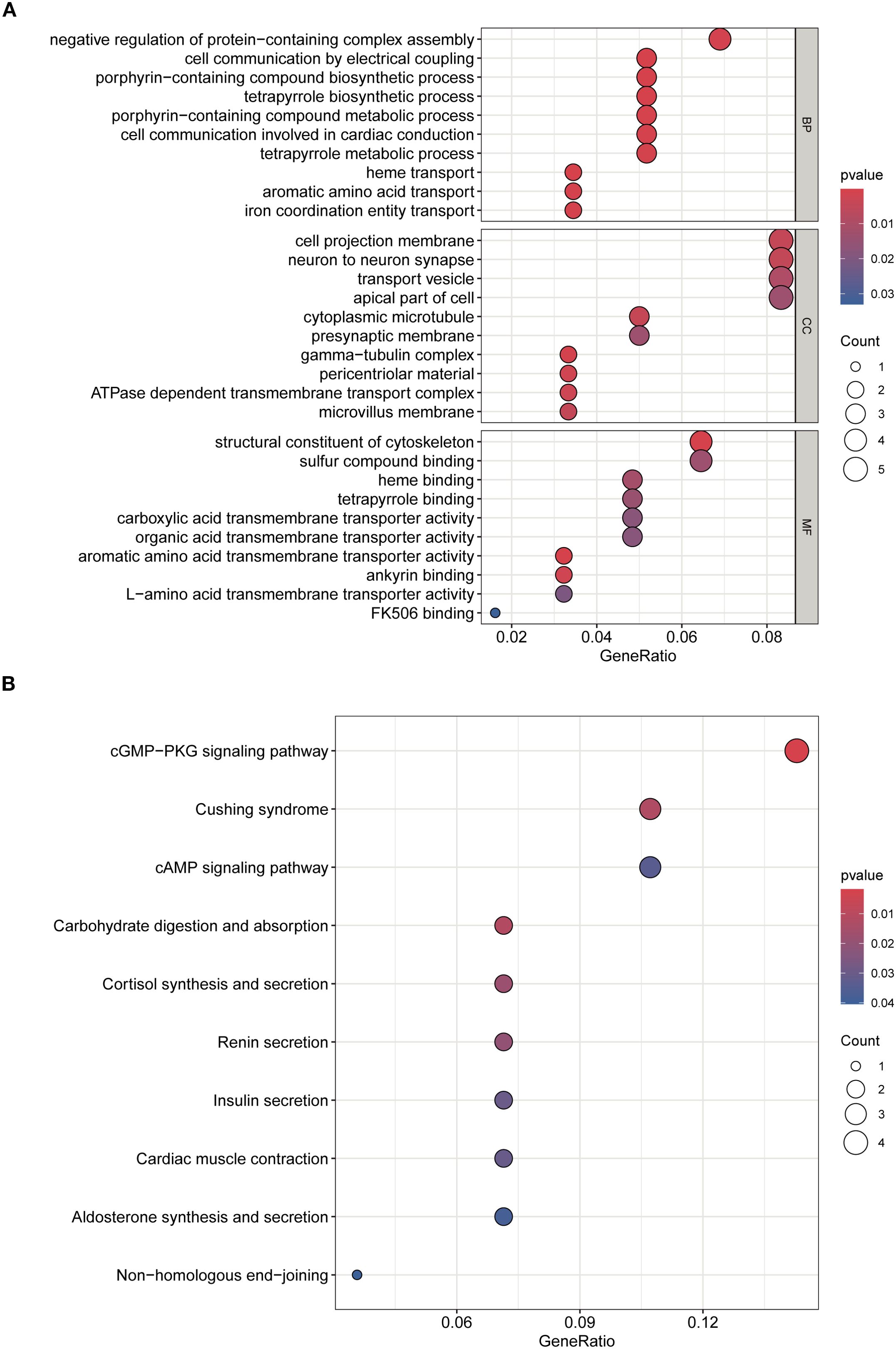 Figure 3. GO and KEGG enrichment analyses of overlapping genes. (A) GO analysis of biological processes (BP), cellular components (CC), and molecular functions (MF). (B) KEGG pathway enrichment analysis. Dot size indicates gene count, color represents adjusted p-value.