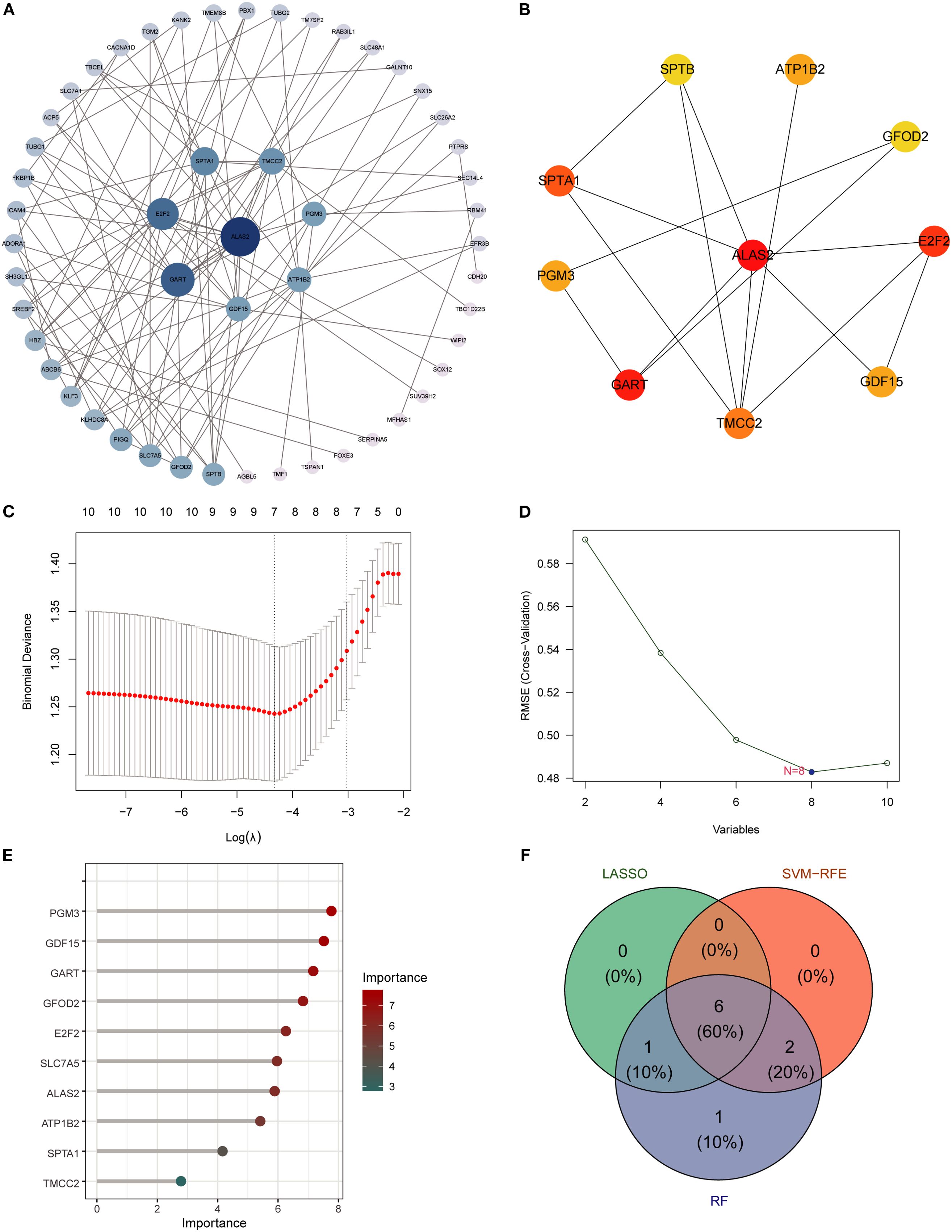 Figure 4. Identification of hub genes using PPI network and machine learning. (A) PPI network of overlapping genes, with node size indicating connectivity. (B) Top hub genes ranked by cytoHubba MCC algorithm. (C) LASSO regression for feature selection. (D) SVM-RFE analysis showing minimal RMSE at 8 variables. (E) Random Forest ranking of gene importance. (F) Venn diagram showing six overlapping hub genes identified by all three algorithms (RF, SVM, LASSO).