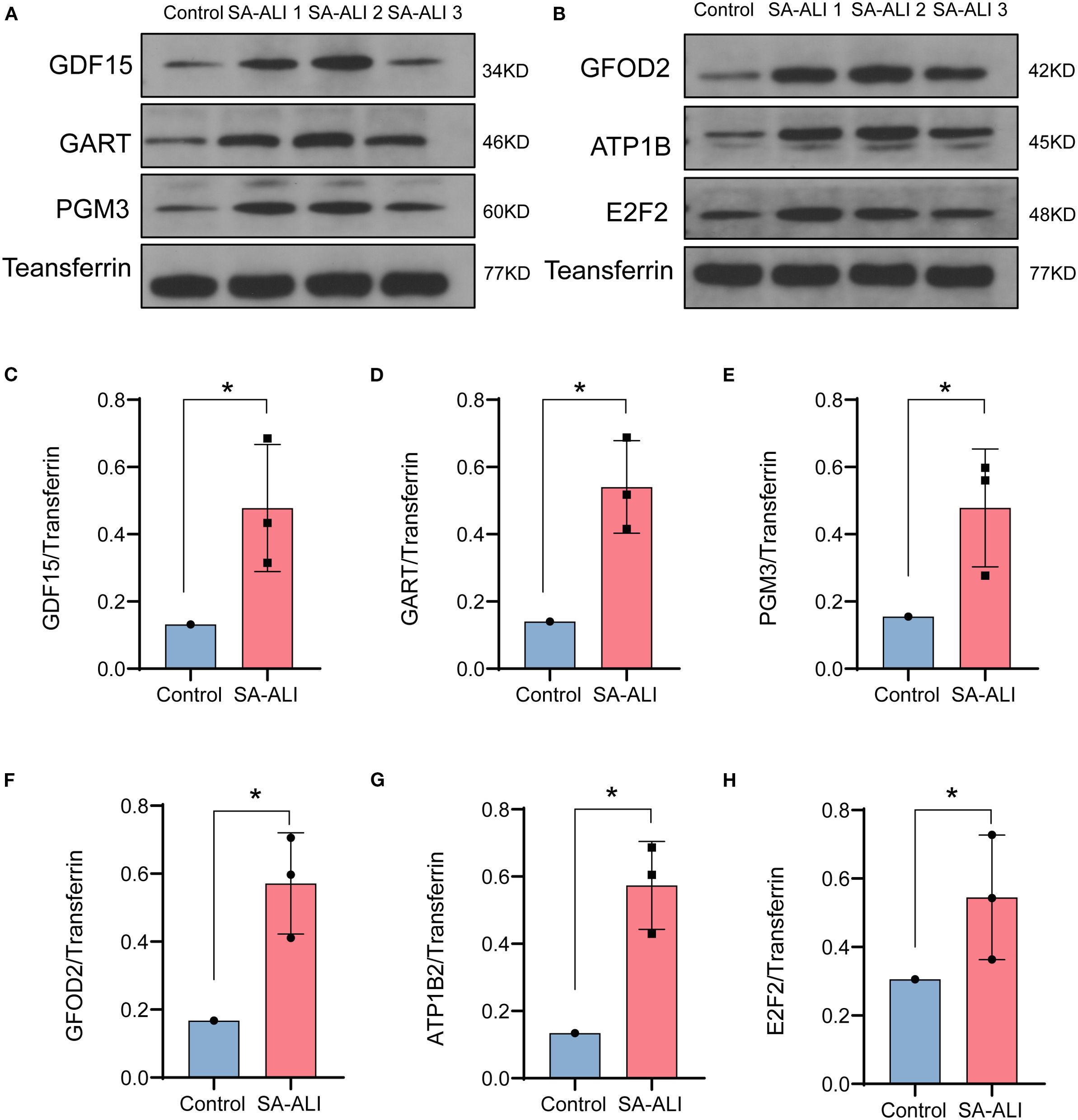 Figure 5. Validation of hub gene expression in SA-ALI by Western blot. (A, B) Representative Western blots showing GDF15, GART, PGM3, GFOD2, ATP1B2, and E2F2 protein levels in control and SA-ALI patient serum, with transferrin as the loading control. (C–H) Quantification of protein expression normalized to transferrin, indicating significant upregulation of all six hub genes in SA-ALI compared with controls (*p < 0.05).