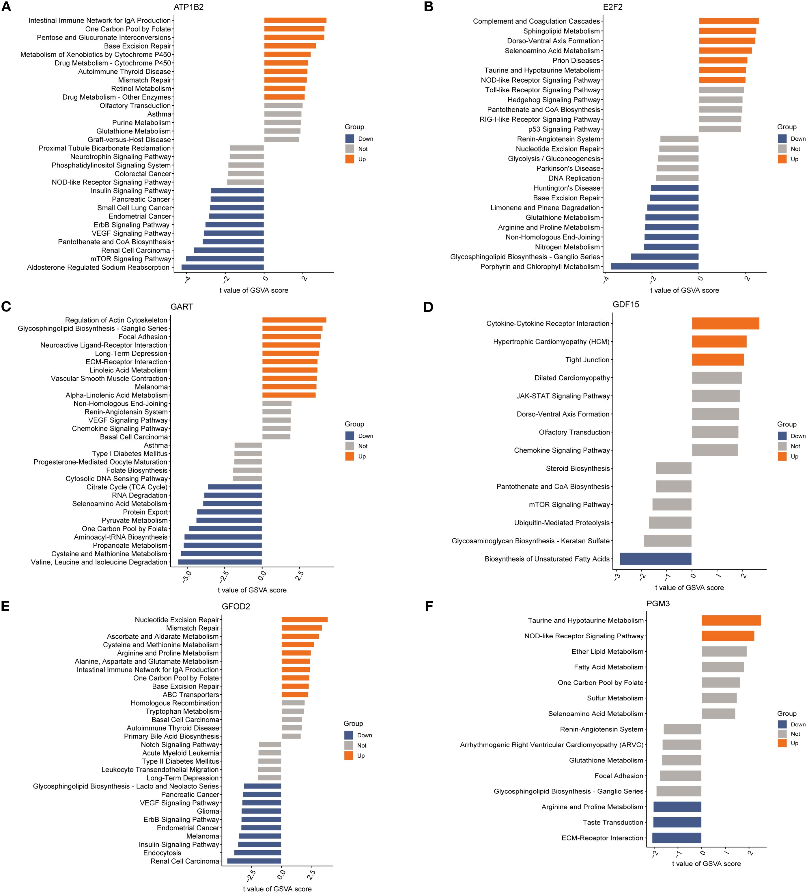 Bar graphs labeled A to F show the t values of GSVA scores for various pathways across different groups indicated by color: Up (orange), Not (grey), and Down (blue). Each graph lists specific pathways along the y-axis and their corresponding t values on the x-axis. Graphs A to F are associated with labels ATP1B2, E2F2, GART, GDF15, GFOD2, and PGM3, highlighting differences in pathway activation or suppression.