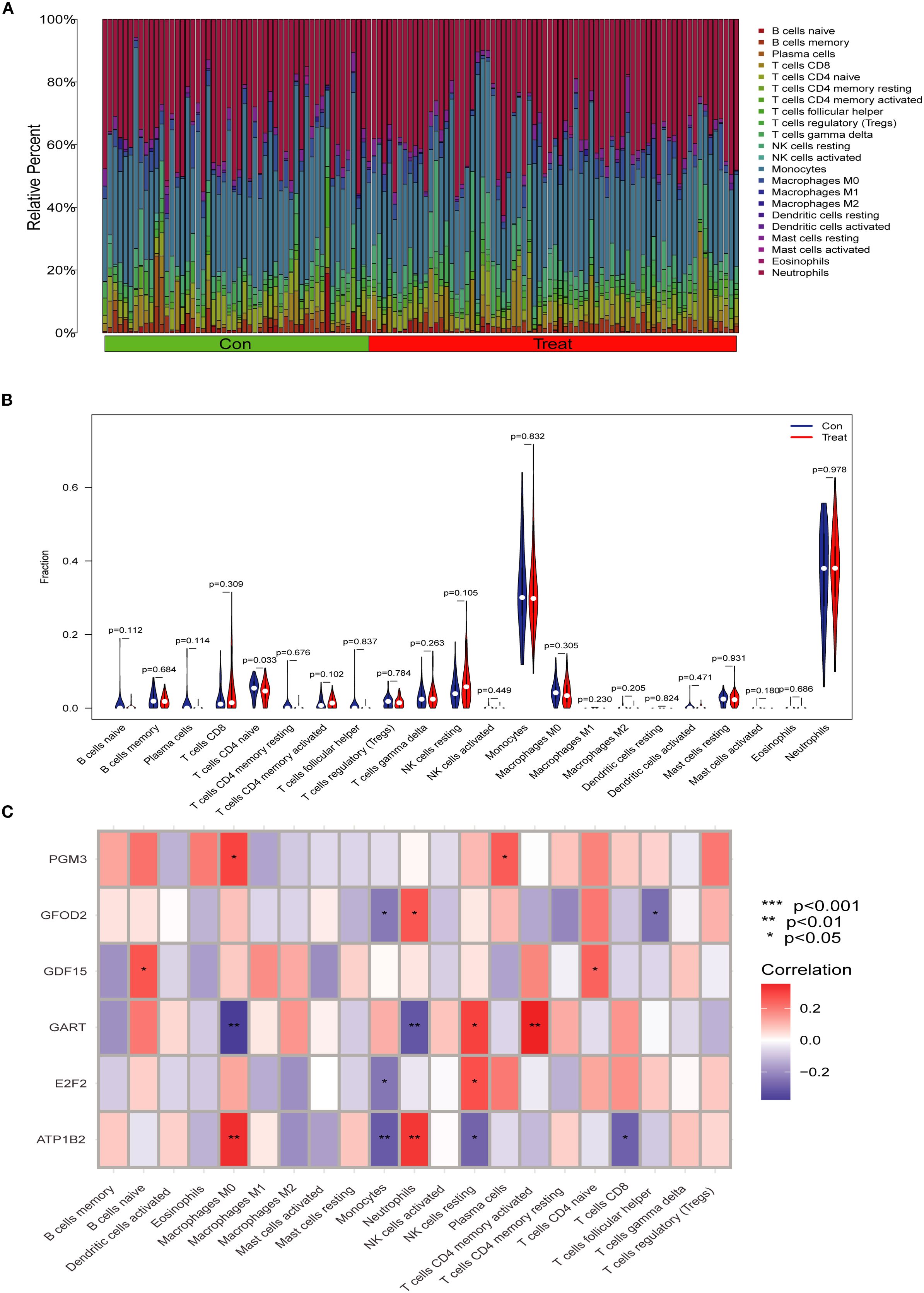 Panel A displays a stacked bar chart showing relative percentages of immune cell types for control (Con) and treatment (Treat) groups, with a color key for various cell types. Panel B features violin plots comparing cell fractions between control and treatment groups with p-values indicated above each plot. Panel C is a heatmap presenting correlations between genes and immune cell types, using color gradients to indicate correlation strength, with significance levels marked by asterisks.