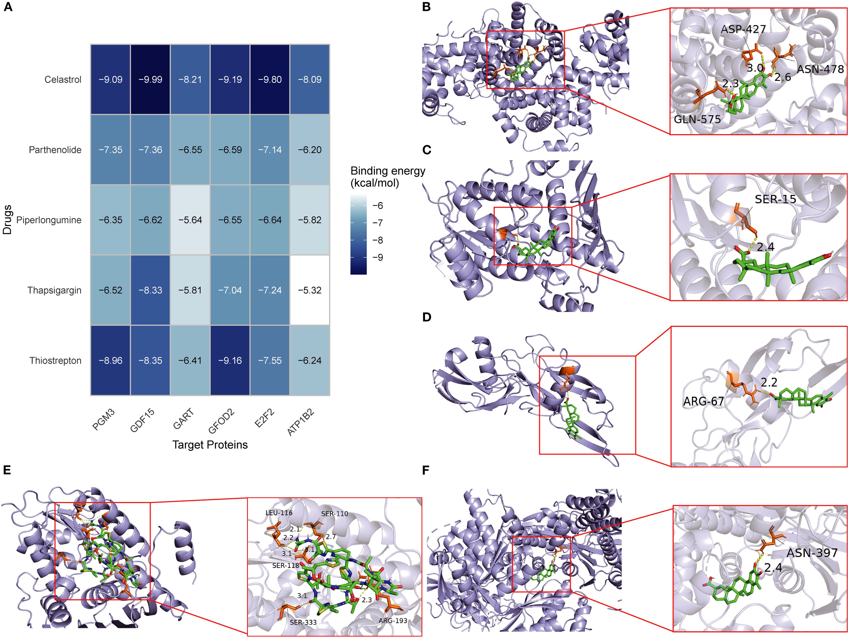 Figure 8. Molecular docking of candidate drugs with hub proteins in SA-ALI. (A) Heatmap showing binding energies (kcal/mol) between five candidate compounds (Celastrol, Parthenolide, Piperlongumine, Thapsigargin, and Thiostrepton) and six hub proteins (PGM3, GDF15, GART, GFOD2, E2F2, ATP1B2). Darker blue indicates stronger binding affinity. (B–F) Representative docking models of Celastrol with GDF15 (B), Parthenolide with PGM3 (C), Piperlongumine with GART (D), Thapsigargin with GFOD2 (E), and Thiostrepton with E2F2 (F). Green sticks represent ligands; orange sticks represent interacting residues.