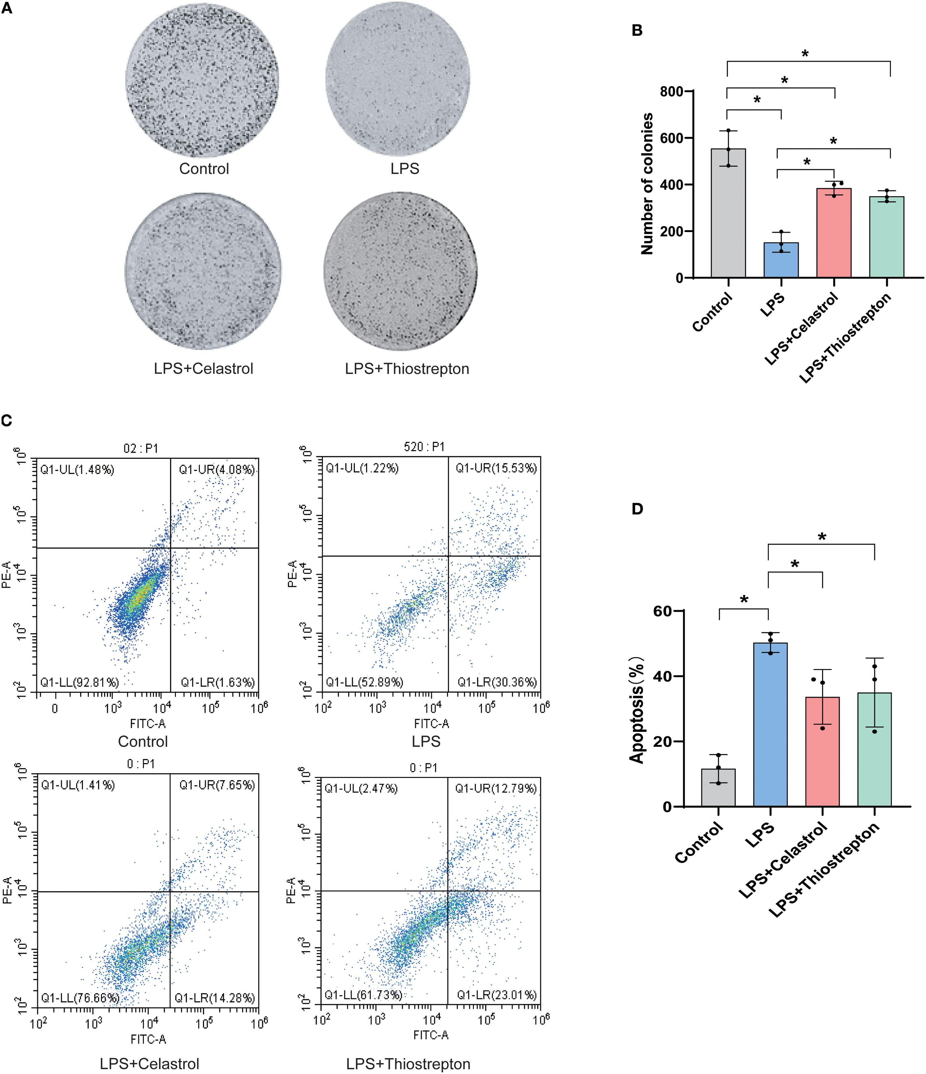 Figure 9. Celastrol and Thiostrepton attenuate LPS-induced apoptosis in alveolar epithelial cells (A549). (A) Representative images of cell colony formation assay in Control, LPS, LPS+Celastrol, and LPS+Thiostrepton groups. (B) Quantification showing that LPS markedly reduced the clonogenic capacity of alveolar epithelial cells, which was partially restored by Celastrol or Thiostrepton. (C) Representative Annexin V-FITC/PI flow cytometry plots displaying early and late apoptotic populations. (D) Quantification of apoptosis rates demonstrating that Celastrol and Thiostrepton reduced LPS-induced apoptosis. Data are presented as mean ± SD; *p < 0.05.