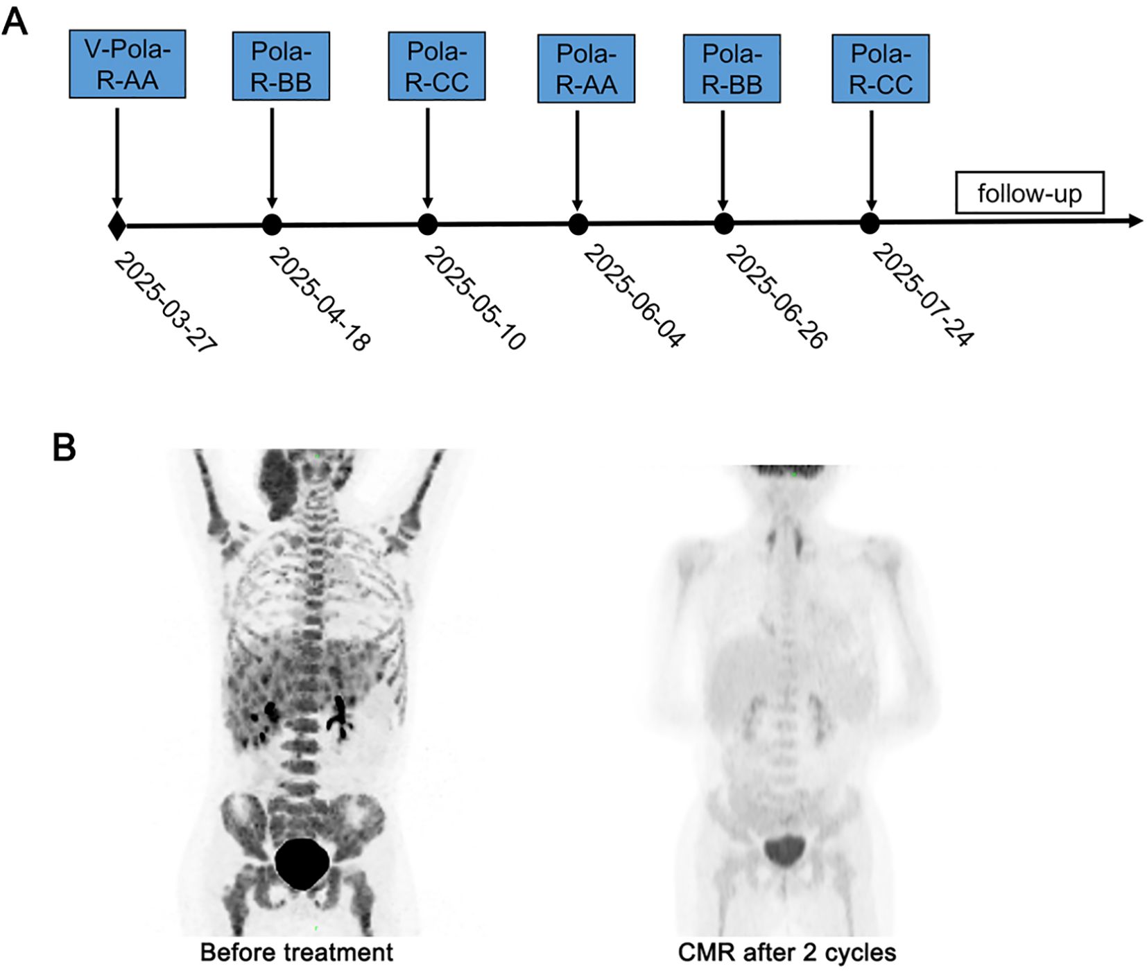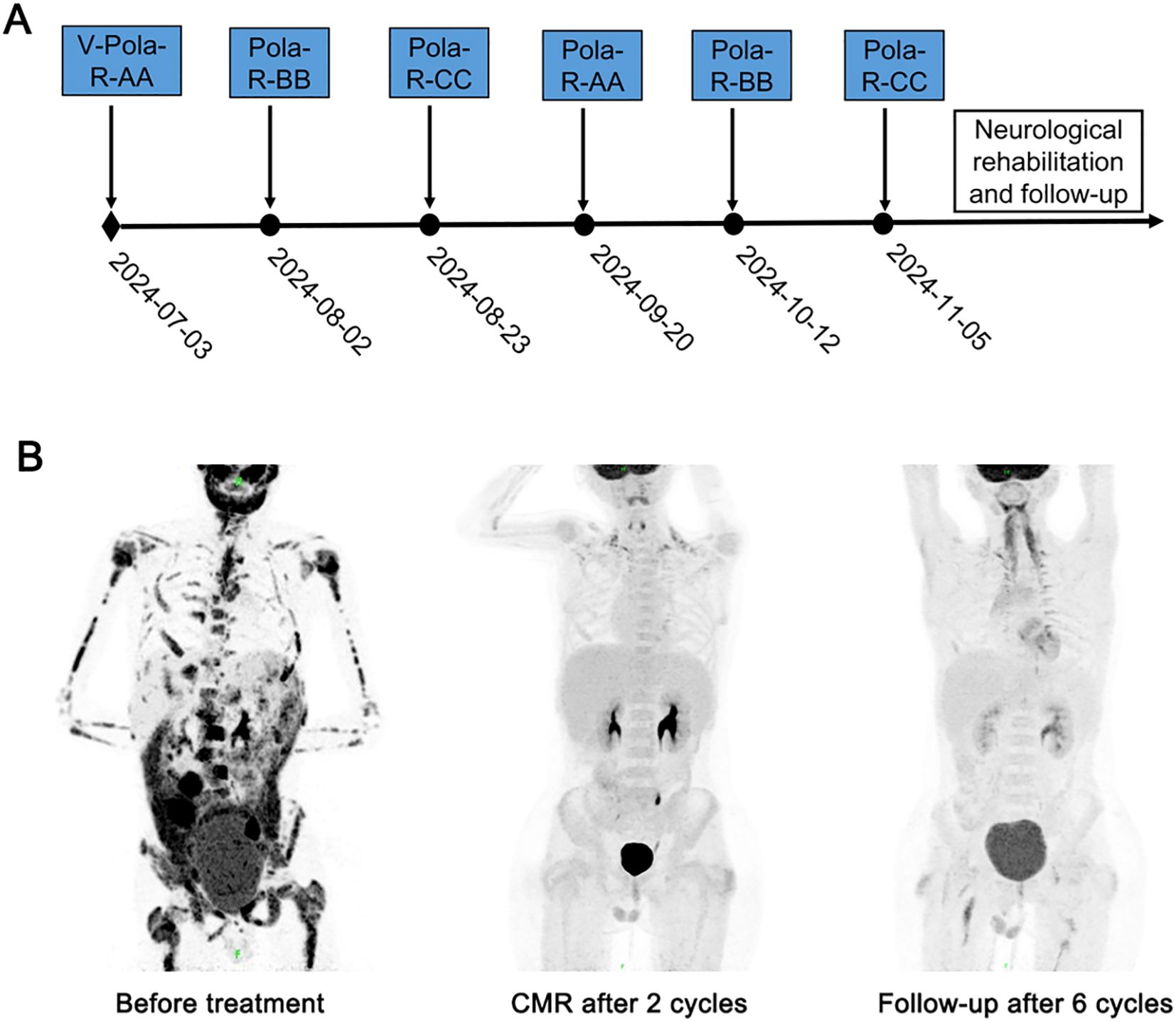 The treatment was initiated after obtaining approval from the Institutional Ethics Committee and written informed consent from the guardian. Following cytoreductive pretreatment with regimen V consisted of low-dose cyclophosphamide and prednisone, a modified BFM95 immunochemotherapy regimen was initiated. This 6-cycle protocol comprised: (1) Polatuzumab vedotin plus Rituximab (Pola-R). (2) Sequentially alternating treatment blocks (AA-BB-CC-AA-BB-CC) (Table 1). All cycles administered at 21-day intervals and required treatment delay not exceeding 7 days for hematologic toxicity, maintaining relative dose intensity (RDI) ≥85%. During cycle 1 immunochemotherapy, the patient developed grade 4 myelosuppression complicated by febrile neutropenia (FN) and grade 2 mucositis, both resolving with supportive measures. After two cycles of immunochemotherapy, PET-CT confirmed CMR, with BM evaluation showing morphological remission. The patient completed six cycles of immunochemotherapy on November 10, 2024. Following cessation of anticancer therapy, neurological rehabilitation was initiated at the Department of Neurorehabilitation. Showing remarkable symptomatic improvement, the patient had significant recovery of sensory function below the T11 level and complete resolution of his initial back pain and toothache. Bimonthly follow-up visits showed no evidence of disease recurrence (Figure 1).