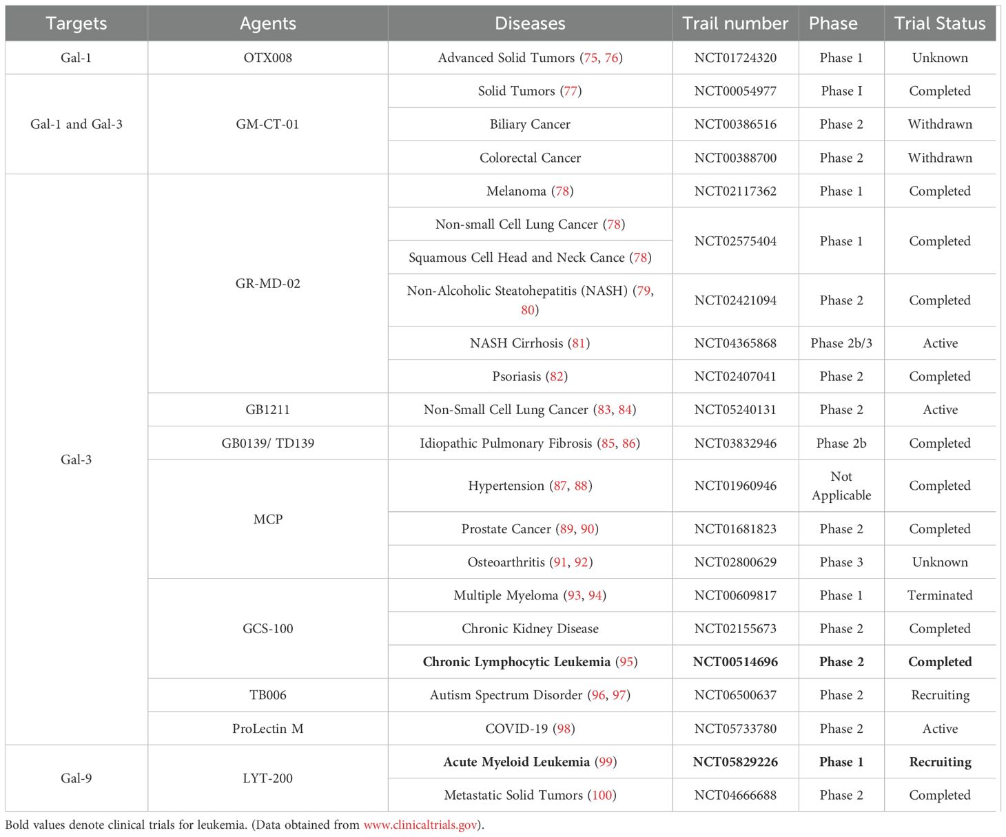Although Gal-1, -3, and -9 play significant roles in leukemia pathogenesis, progression, invasion, and stemness maintenance, their functional outcomes exhibit starkly contrasting effects contingent upon cellular states and microenvironmental contexts. Therefore, developing highly specific inhibitors represents a critical imperative (2). Recent advancements in understanding the pathophysiological functions of galectins have catalyzed the development of diverse therapeutic agents targeting Gal-1, -3, and -9, some of which have been evaluated in clinical trials (Table 1). Available pharmacological strategies can be classified into four categories (1): small-molecule inhibitors targeting the CRDs of galectins; (2) modified polysaccharides and their synthetic analogs designed to interfere with galectin–glycan interactions; (3) peptide-based inhibitors and peptidomimetics with high binding specificity; and (4) biologic therapeutics, including siRNA-based platforms, high-affinity aptamers, engineered truncated galectin variants, and monoclonal neutralizing antibodies. Despite significant advances in targeted therapeutic development, progress in translating galectin inhibitors into clinical applications for leukemia treatment remains limited. To date, only a limited number of Gal-1, -3 and -9 inhibitors have advanced to preclinical or clinical evaluation specifically focused on leukemia.