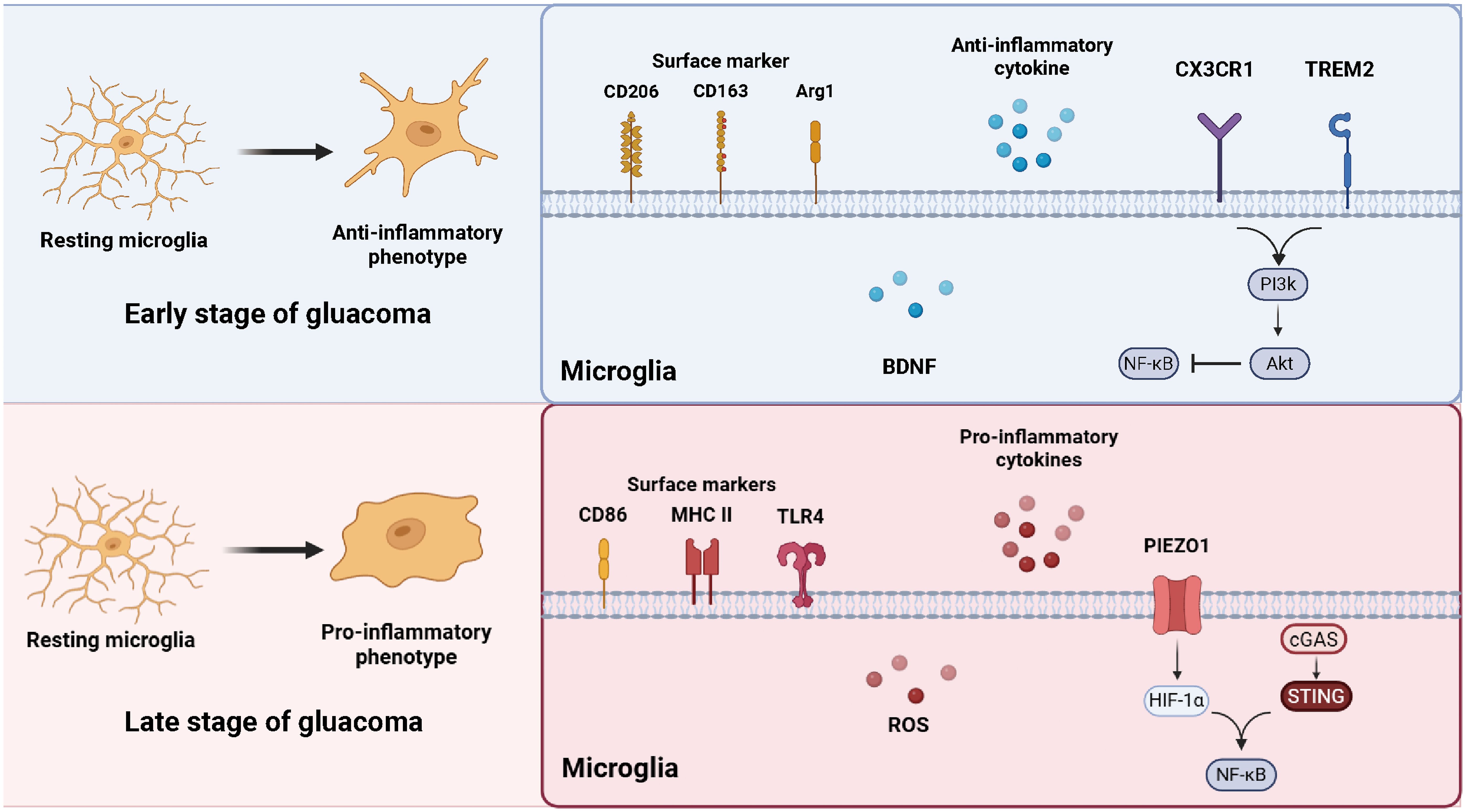 Figure 1. Microglial phenotypic transformation during glaucoma. In the early stage of glaucoma, resting microglia shift toward an anti-inflammatory phenotype, characterized by the expression of surface markers CD206, CD163, and ARG1, and the release of neuroprotective factors such as BDNF, CX3CR1 and TREM2 signaling maintain microglial homeostasis through the PI3K/AKT and NF-κB pathways. In the late stage, microglia adopt a pro-inflammatory phenotype expressing CD86, MHC II, and TLR4, accompanied by increased production of ROS and pro-inflammatory cytokines. External stimulus further triggers the cGAS–STING and HIF-1α–NF-κB pathways, amplifying neuroinflammation and contributing to RGC degeneration. (The figure is created by https://www.biorender.com/).