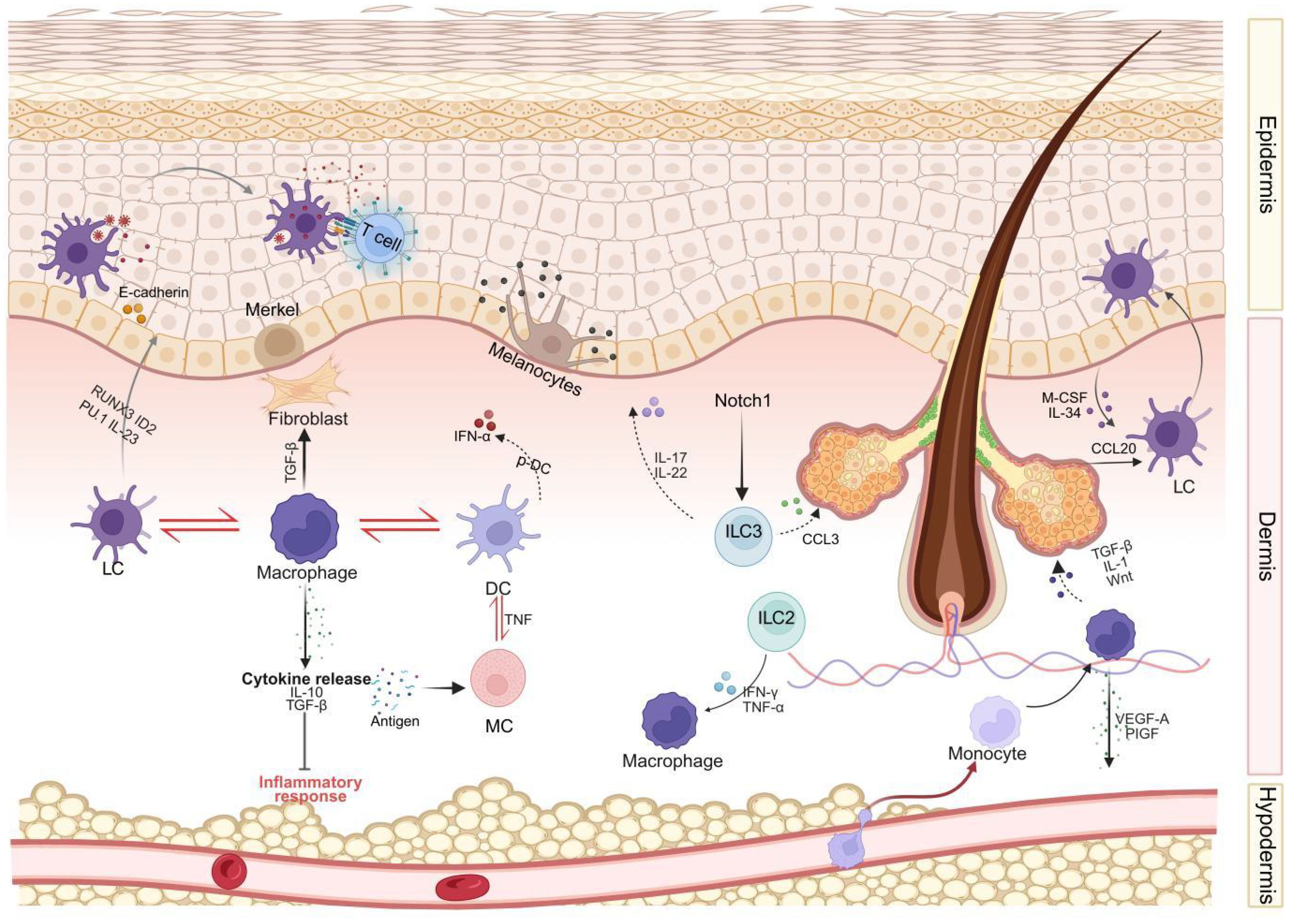 Figure 1. An integrated model of immune cell interactions during human skin development. This diagram integrates key signaling pathways, cell types, and interactions elucidated in human skin, encompassing different skin layers (epidermis, dermis, subcutaneous tissue). Langerhans cells (LCs) and T cells reside in the epidermal layer, interacting with keratinocytes, melanocytes, and Merkel cells. The dermis harbors a complex network comprising Langerhans cells (LCs), macrophages, dendritic cells (DCs), mast cells (MCs), innate lymphoid cells (ILCs), and fibroblasts. These cells interact both with each other (e.g., cross-talk between LCs-macrophages-DCs, DCs-MCs, macrophages-fibroblasts, and ILCs-keratinocytes) and with structural components such as hair follicles. Illustrated key signaling pathways include cytokine secretion (e.g., IL-10, TGF-β, VEGF released by macrophages; IL-17, IL-22, CCL3 released by ILC3) and chemokine secretion (e.g., CCL20 guiding Langerhans cells). Subcutaneous tissue and its vascular network support immune cell infiltration and are regulated by adipokines. LC, Langerhans cells; DC, dendritic cells; MC, mast cells; ILC, innate lymphoid cells; TNF-α, tumor necrosis factor-α; IFN-γ, interferon-γ; IL, interleukin; TNF, Tumor Necrosis Factor; TGF-β, transforming growth factor-β; VEGF, vascular endothelial growth factor; CCL, Chemokine (C-C motif) ligand; M-CSF, Macrophage colony-stimulating factor; PlGF, Placental Growth Factor; RUNX3, Runt-related transcription factor 3; ID2, Inhibitor of DNA binding 2.