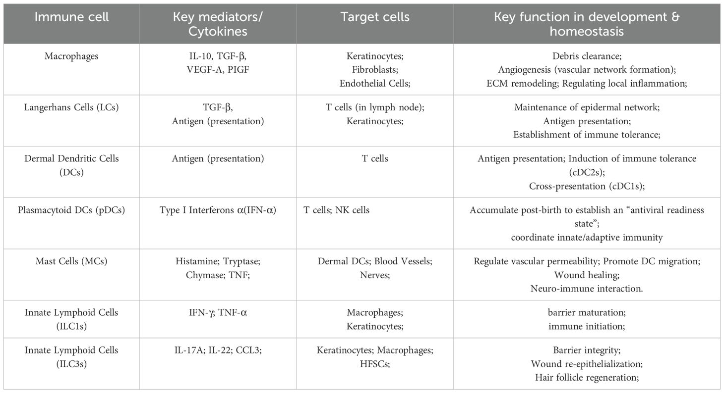 Recent advances in developmental immunology have challenged this view. Innate immune cells (particularly macrophages) not only perform traditional immune functions but also regulate key aspects of human prenatal skin morphogenesis—including follicle formation, scar-free healing, and angiogenesis—through cross-cell interactions with epidermal cells, fibroblasts, and endothelial cells (6, 7). During embryogenesis, macrophages (8, 9), Langerhans cells (LCs) (10, 11), mast cells (MCs) (12, 13), and innate lymphoid cells (ILCs) (14, 15) colonize the skin and influence morphogenesis by secreting growth factors, modulating cell proliferation and apoptosis, and orchestrating extracellular matrix remodeling (Table 1).