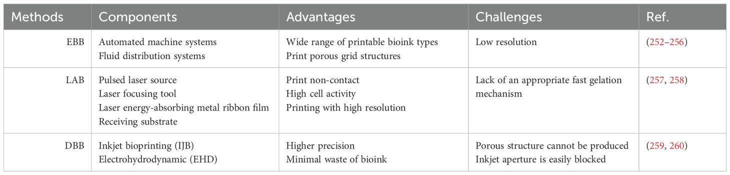 The development of tissue-engineered skin using 3D bioprinting represents a cutting-edge approach in the field of skin wound healing and grafting. Full-thickness skin replacement is limited by the shortage of donor skin, immune rejection, and the risk of infection (250) 3D bioprinting is considered to have a profound impact on the field of tissue engineering. Over the past decades, a variety of 3D-bioprinted skin models have been developed for applications such as skin irritation testing and drug efficacy screening (251). Three widely applied 3D bioprinting techniques include extrusion-based bioprinting (EBB), laser-assisted bioprinting (LAB), and droplet-based bioprinting (DBB) (Table 3).