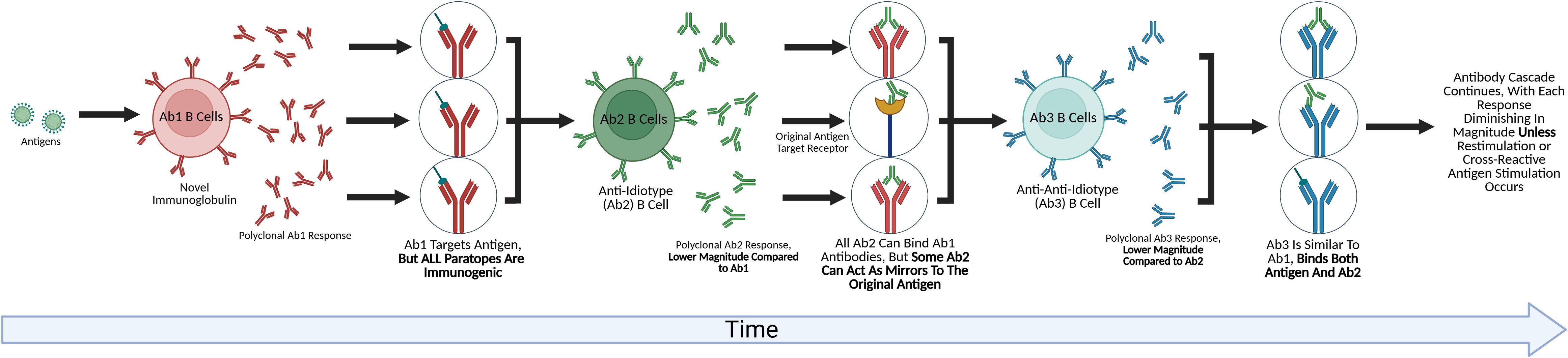 Figure 1. The future of idiotype network exploration. This figure depicts an anti-idiotype antibody cascade. B-cells responding to an antigen produce a novel antibody that has undergone VDJ rearrangement, or the Ab1 antibody. Because this antibody is novel to the host, a symmetrical Ab2 anti-idiotypic response is mounted against it. While all of the Ab2 antibodies are capable of binding the Ab1 and Ab1 producing B cells, some Ab2 paratopes have the potential to target the original targets of the antigen that triggered the Ab1 response, such as receptors. The Ab2 response also triggers an Ab3 response, in which all Ab3 can bind the Ab2, with some also having the potential of binding the original antigen that caused the cascade. Each wave of the cascade is of a lower magnitude than the previous, with Cazenave (24) demonstrating a 10-100x lower titer for the Ab2 onwards, eventually becoming undetectable, though chronic stimulation or repeated restimulation could amplify each wave of the cascade (25).