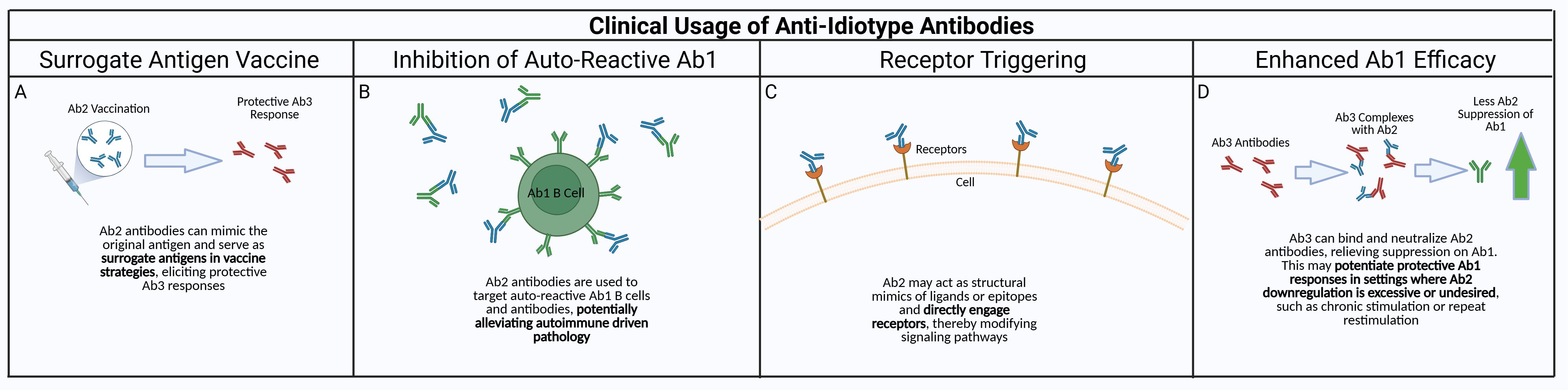 Figure 2. Potential clinical applications of anti-idiotype antibodies. Anti-idiotype antibodies have properties that could be exploited to produce viable clinical therapeutics. (A) Due to the anti-idiotype mirroring the Ab1 antibody, and thus the original target antigen of the antibody, a “surrogate” antibody vaccine utilizing Ab2 could be used to generate protective responses without exposing the patient to the actual antigen. (B) Autoreactive Ab1/Ab1-producing B cells could be targeted by using Ab2 against them, alleviating autoreactive driven immune pathology. This could also be taken a step further with Ab3 antibodies against autoreactive Ab2 antibodies, since Ab2 could have the ability to bind the host receptors that would be targeted by the original antigen. (C) Ab2 can also be used for receptor triggering when pathway activation is therapeutically beneficial. While many receptors are activated by ligand-induced dimerization, anti-idiotype antibodies can elicit or modulate receptor signaling through several alternative mechanisms, including higher-order receptor clustering, stabilization of pre-existing receptor dimers, FcγR-mediated crosslinking, or allosteric conformational changes that bias signaling without forming dimers (39). (D) Ab2 hinder Ab1 antibody responses – this can be detrimental if the Ab2 response is overamplified in conditions such as chronic stimulation/inflammation or repeated restimulation. This could be mediated by using Ab3 antibody against the Ab2, enhancing the Ab1 response in the absence of Ab2 suppression.