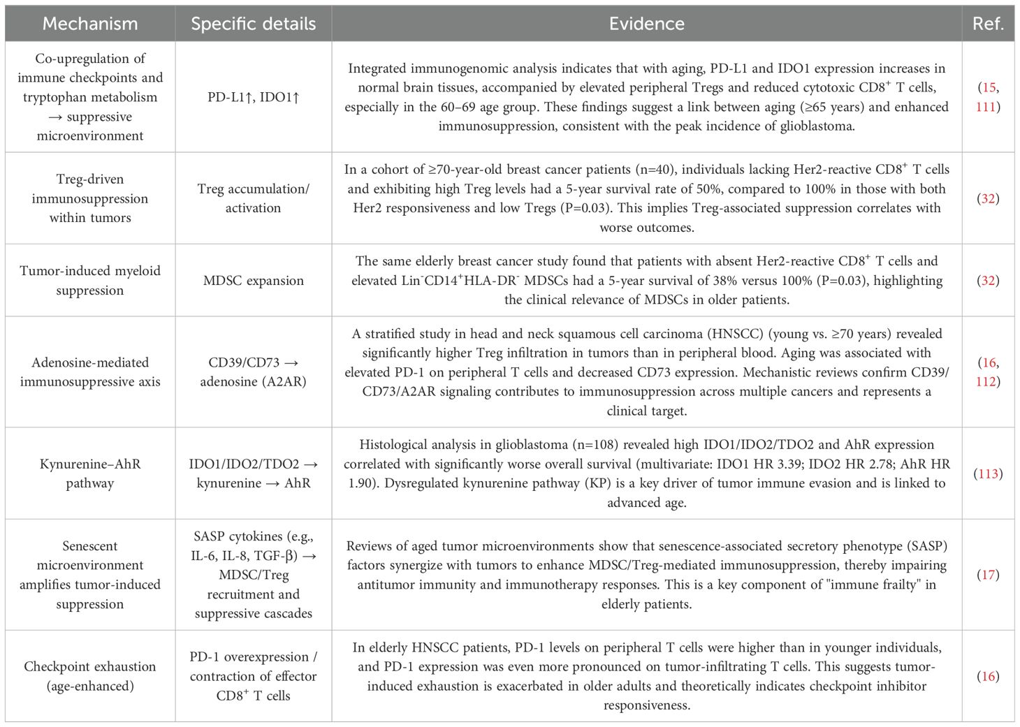 Tumor-induced immunosuppression is commonly observed in this population (Table 1). Specifically, cancer cells suppress effector T cell activity and function through the secretion of immunosuppressive cytokines such as transforming growth factor-β (TGF-β), interleukin-10 (IL-10), and vascular endothelial growth factor (VEGF) (28, 29). In addition, they activate suppressive metabolic pathways, including the denosine axis (CD39/CD73 → adenosine) and the tryptophan–kynurenine–AhR pathway (IDO1/IDO2/TDO2 → Kyn → AhR), further impairing T cell function (16). Tumor cells may also directly engage inhibitory immune checkpoints, such as programmed death-ligand 1 (PD-L1) and cytotoxic T lymphocyte-associated protein 4 (CTLA-4), thereby inducing T cell apoptosis (30). Concurrently, the tumor immune microenvironment recruits and activates suppressive cell populations such as regulatory T cells (Tregs) and myeloid-derived suppressor cells (MDSCs), both of which significantly inhibit antitumor immunity (31). The situation is further compounded by pro-inflammatory cytokines secreted via the senescence-associated secretory phenotype (SASP), including IL-6, IL-8, and TGF-β, which synergize with tumor-derived signals to exacerbate MDSC and Treg-mediated immunosuppression (17). This immunosuppressive milieu is frequently observed in elderly cancer patients and is associated with a reduced 5-year survival rate of just 38–50% among breast cancer patients aged over 70 years (32).