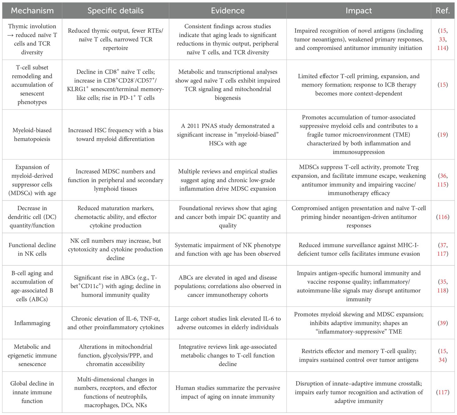 Age-related immunosenescence leads to thymic involution and a marked reduction in naïve T cells and T cell receptor (TCR) diversity and quantity, thereby compromising antigen recognition and immune responsiveness (15, 33). Metabolic reprogramming also occurs in aged T cells, affecting mitochondrial function, glycolytic pathways, and chromatin accessibility, which diminishes the quality of both effector and memory T cells (15, 34). In addition to T cell defects, age-related B cells (ABCs), particularly the T-bet+CD11c+ phenotype, become more prevalent, weakening humoral immune responses and impairing antigen-specific and antitumor immunity (35). Hematopoietic stem cells (HSCs) in the elderly exhibit a “myeloid bias” (19), resulting in increased MDSC production and activity, suppression of T cell function, and enhanced Treg expansion (36). Aging also impairs dendritic cell (DC) maturation, chemotactic ability, and cytokine secretion, leading to both quantitative and functional decline. Although natural killer (NK) cell numbers may increase with age, their cytotoxicity and cytokine production capacity are significantly diminished, compromising the first line of defense against tumors (37, 38). Moreover, elderly individuals often present with “inflammaging,” a pro-inflammatory state strongly associated with adverse outcomes such as frailty and mortality. This state is marked by chronically elevated levels of IL-6 and TNF-α (39), which further promote myeloid skewing and MDSC expansion, suppress adaptive immunity, and contribute to a tumor microenvironment characterized by both immunosuppression and chronic inflammation (40). These immunosenescence-related changes collectively result in profound immunosuppression (Table 2).