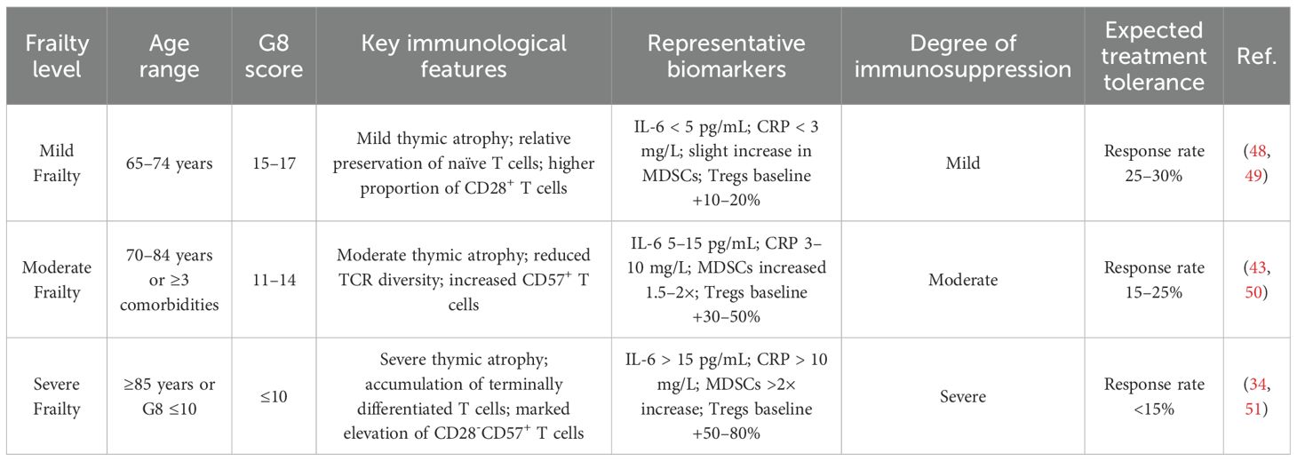 Moreover, the degree of frailty across different stages of aging significantly impacts the immune system of elderly cancer patients (Table 4). Patients with mild frailty (65–74 years, G8 score 15–17) typically exhibit only mild thymic involution. Naïve T cells are relatively preserved, baseline inflammatory markers such as IL-6 remain low (<5 pg/mL), MDSCs show only slight increases, and Tregs expand modestly (baseline +10–20%). As a result, these patients retain a 25–30% response rate to immunotherapy (48, 49). In contrast, moderately frail patients (70–84 years or ≥3 comorbidities, G8 score 11–14) exhibit more pronounced thymic atrophy, significant reductions in TCR diversity, elevated inflammatory load (IL-6 at 5–15 pg/mL), 1.5–2-fold expansion of MDSCs, and a 30–50% increase in Tregs, resulting in reduced immunotherapy response rates of 15–25% (43, 50). Severely frail patients (≥85 years or G8 score ≤10) show marked thymic atrophy, accumulation of terminally differentiated T cells (notably increased CD28–CD57+), and severe baseline inflammation (IL-6 >15 pg/mL). MDSCs are elevated by more than 2-fold, and Tregs expand by 50–80%, leading to immunotherapy response rates dropping below 15% (34, 51). These frailty-related immune differences across age groups directly affect the efficacy of OV therapy by modulating immune responsiveness, ultimately influencing therapeutic outcomes and associated risks.