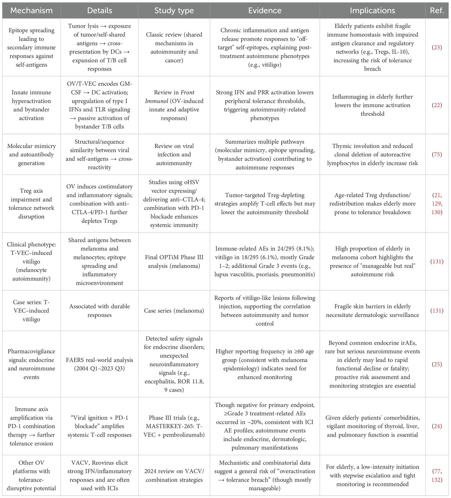 Table 7 provides a comprehensive overview of the mechanisms, evidence, and clinical data supporting OV-induced disruption of immune self-tolerance.