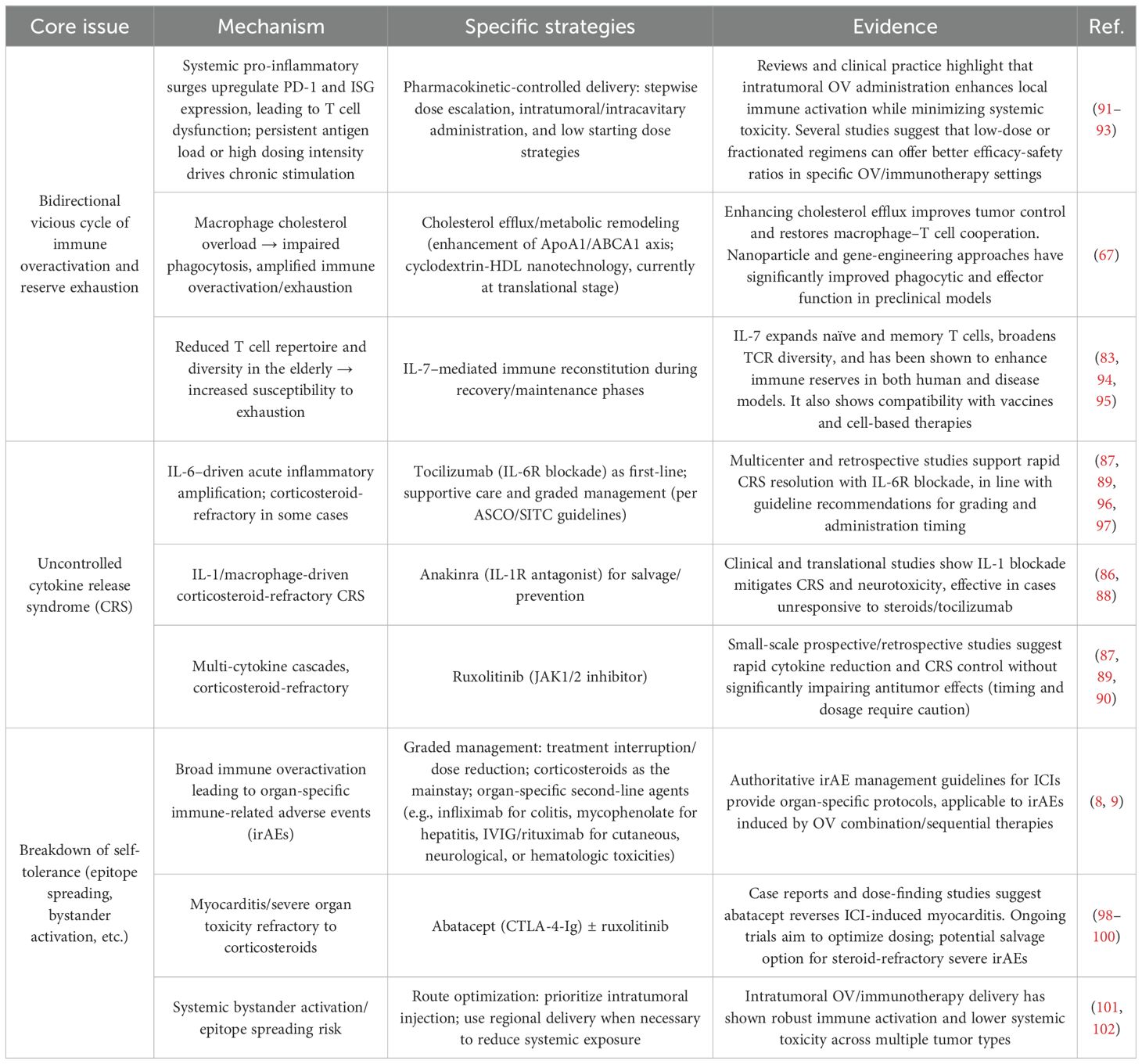 The disruption of immune tolerance associated with OV-based regimens will be managed using a structured irAE management protocol based on current ICI guidelines. First-line glucocorticoids will serve as foundational therapy, with second-line, organ-specific agents such as infliximab for colitis, mycophenolate mofetil for hepatitis, and IVIG/rituximab for dermatologic and hematologic toxicity (8, 9). For cardiotoxicity, the combination of abatacept (CTLA-4-Ig) and ruxolitinib has shown promise in reversing ICI-induced myocarditis (98–100). Drug delivery route optimization—via intratumoral or regional administration when possible—will further reduce systemic exposure and minimize the risk of bystander immune activation (101, 102), offering a holistic strategy to restore immune tolerance.
