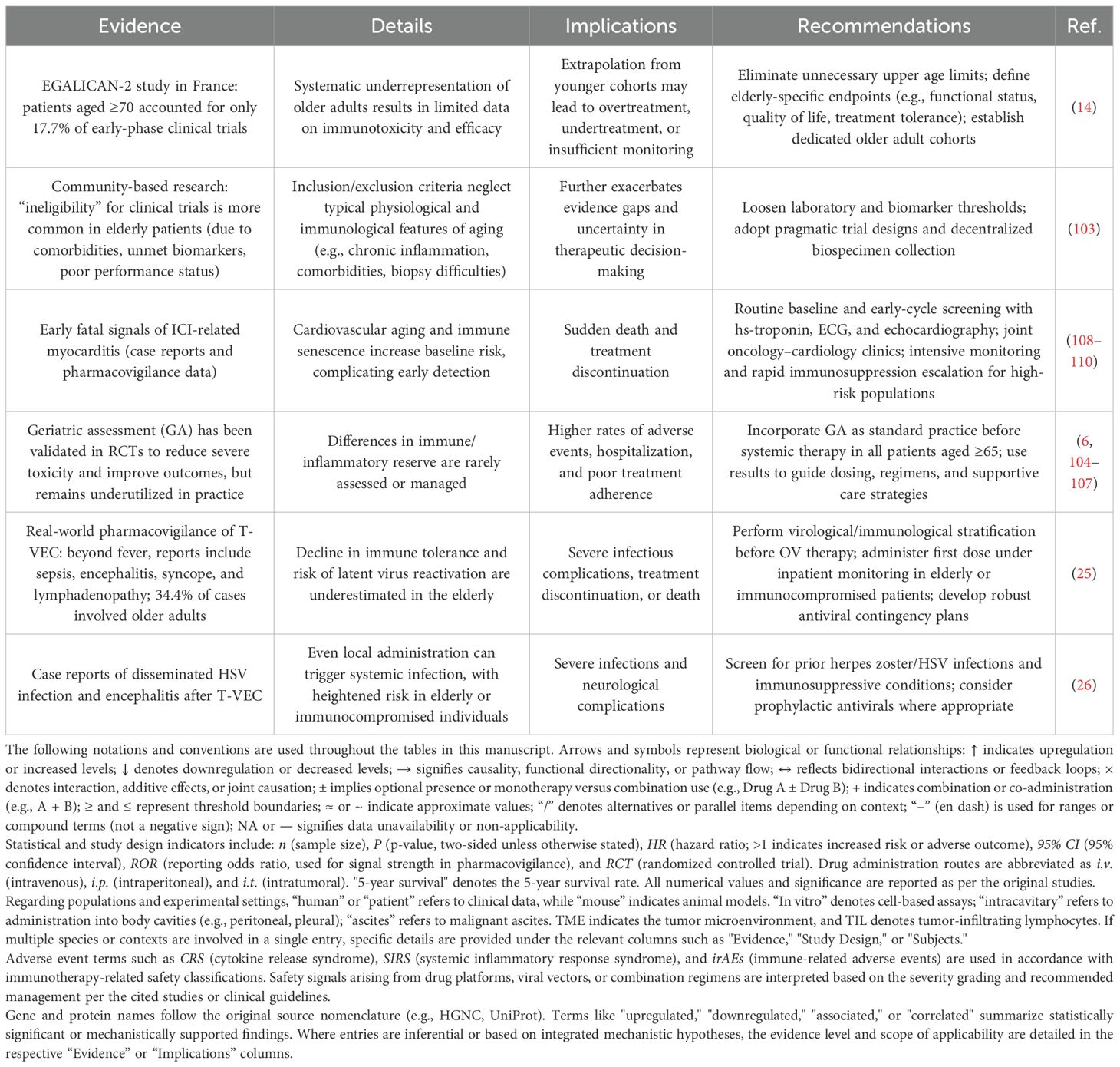 Despite these advancements, the unique immune landscape of elderly cancer patients remains marginalized (Table 10). Due to comorbidities, suboptimal biomarker profiles, and compromised performance status (103), elderly individuals comprise only 17.7% of early-phase clinical trial participants (14). Within the context of OV therapy, elderly patients account for 34.4% of immune-related adverse events (25), and are at heightened risk of severe complications—such as disseminated HSV infection or encephalitis—even with localized treatments like T-VEC (26).