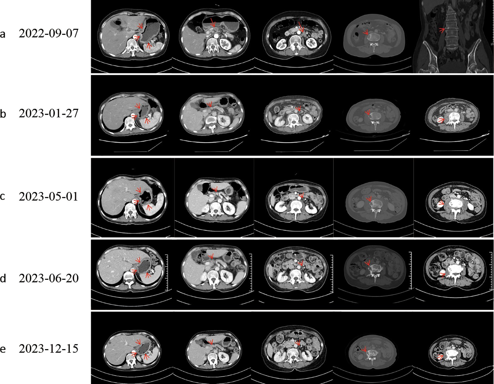 Figure 1. Computed tomography evaluation. Following effective therapy, the patient exhibited decreased gastric wall thickness, reduced osteolytic destruction of bone metastases, increased osteoblastic changes, and diminished perilesional soft-tissue components around osseous metastases. (a) Baseline. (b) Evaluation after progression of first-line chemotherapy. (c) Evaluation after progression of second-line chemotherapy; L3 vertebral metastasis showed progressive osteolytic destruction with an expanding perilesional soft-tissue mass. (d, e) The best response to targeted therapy was a partial response (PR).