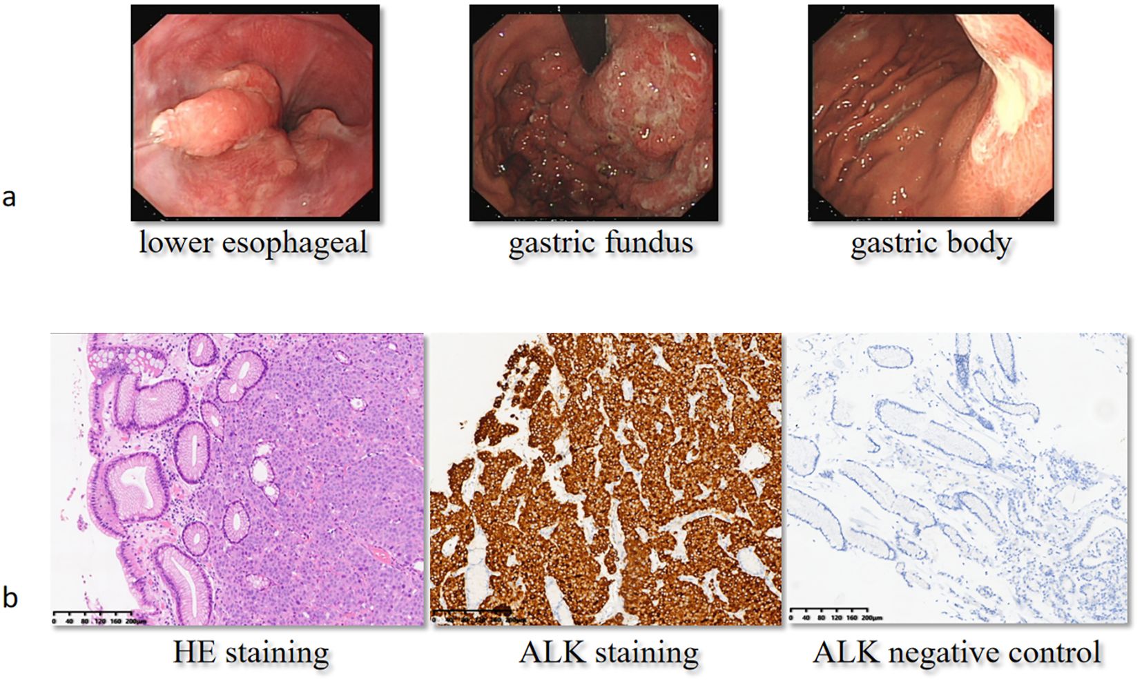 Figure 2. Gastroduodenoscopy and immunohistochemical analysis at baseline. On September 8, 2022, the patient received a gastroduodenoscopy (a), and the pathologist reported poorly differentiated carcinoma with positive ALK staining (b). H&E, hematoxylin and eosin; ALK, anaplastic lymphoma kinase.