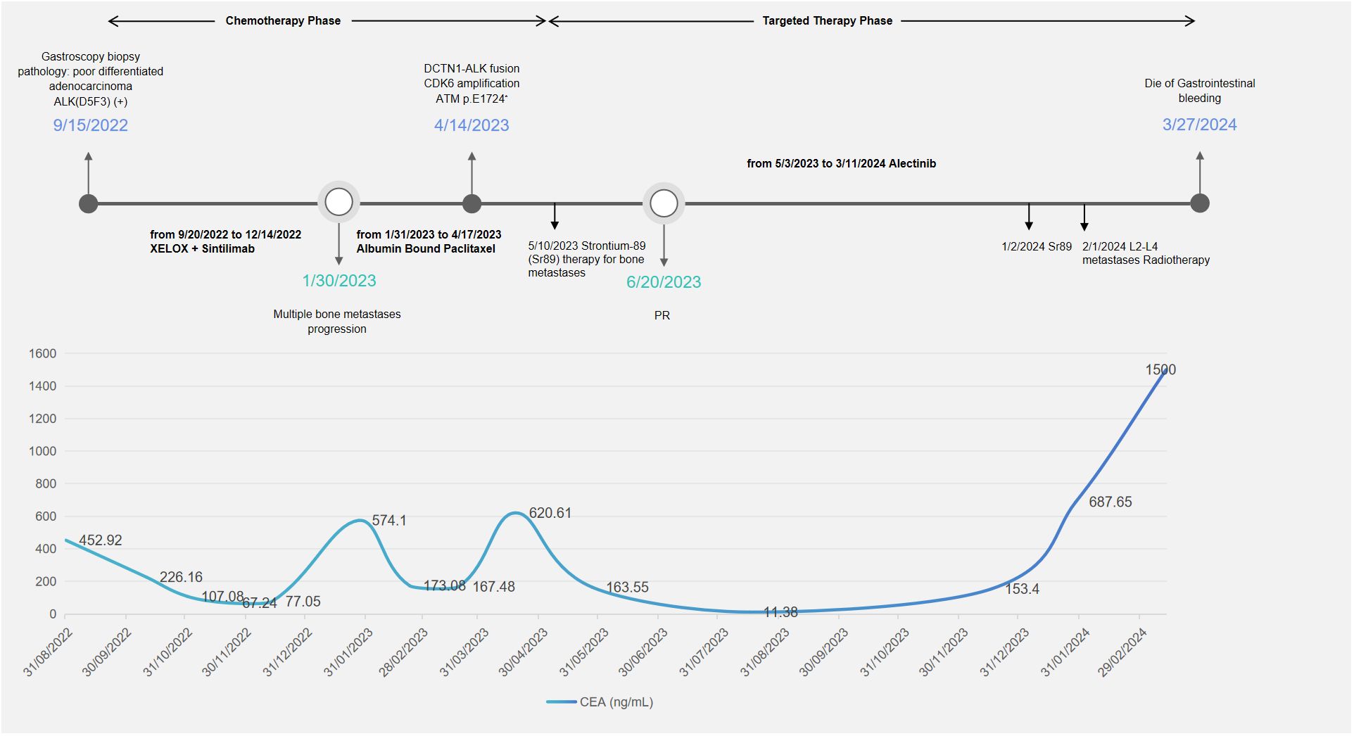 In January 2024, surveillance revealed a marked surge in CEA, suggesting incipient, gradual resistance to targeted therapy. Subsequent MRI of the L3 vertebra revealed epidural spinal cord compression from osseous metastasis, prompting palliative radiotherapy to the L2–L4 metastatic lesion in February 2024. The whole blood circulating tumor DNA (ctDNA) gene test revealed the disappearance of the original DCTN1–ALK fusion and the concomitant emergence of a de novo KRAS amplification mutation. The patient subsequently experienced fulminant systemic progression and ultimately died of uncontrollable gastrointestinal hemorrhage.