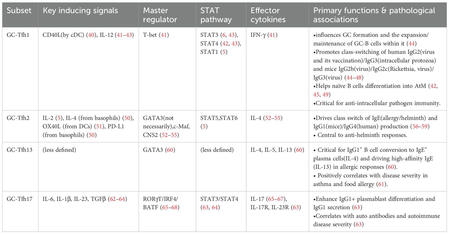 A defining hallmark of Tfh cells is their profound heterogeneity, which can be categorized along two primary dimensions: spatial distribution and functional phenotype. Based on their anatomical positioning, Tfh cells are compartmentalized into distinct subsets: GC-Tfh residing within GCs, FM-Tfh (follicular mantle Tfh) in FM (follicular mantle zone), cTfh (circulating Tfh) patrolling the periphery blood, and peripheral helper T cells (Tph) (2), as well as mucosal tissue Tfh. They share B cells helper function, although they possess differences in phenotype. Tfh cells exhibit functional plasticity, giving rise to subsets that co-express the typical transcription factors and cytokines of other T helper cell lineages (e.g., T-bet(T-box Transcription Factor, TBX21)/IFN-γ in Tfh1, GATA3/IL-4 in Tfh2, and RORγT(RAR-related orphan receptor C)/IL-17 in Tfh17), thereby tailoring antibody responses to specific immunological challenges.