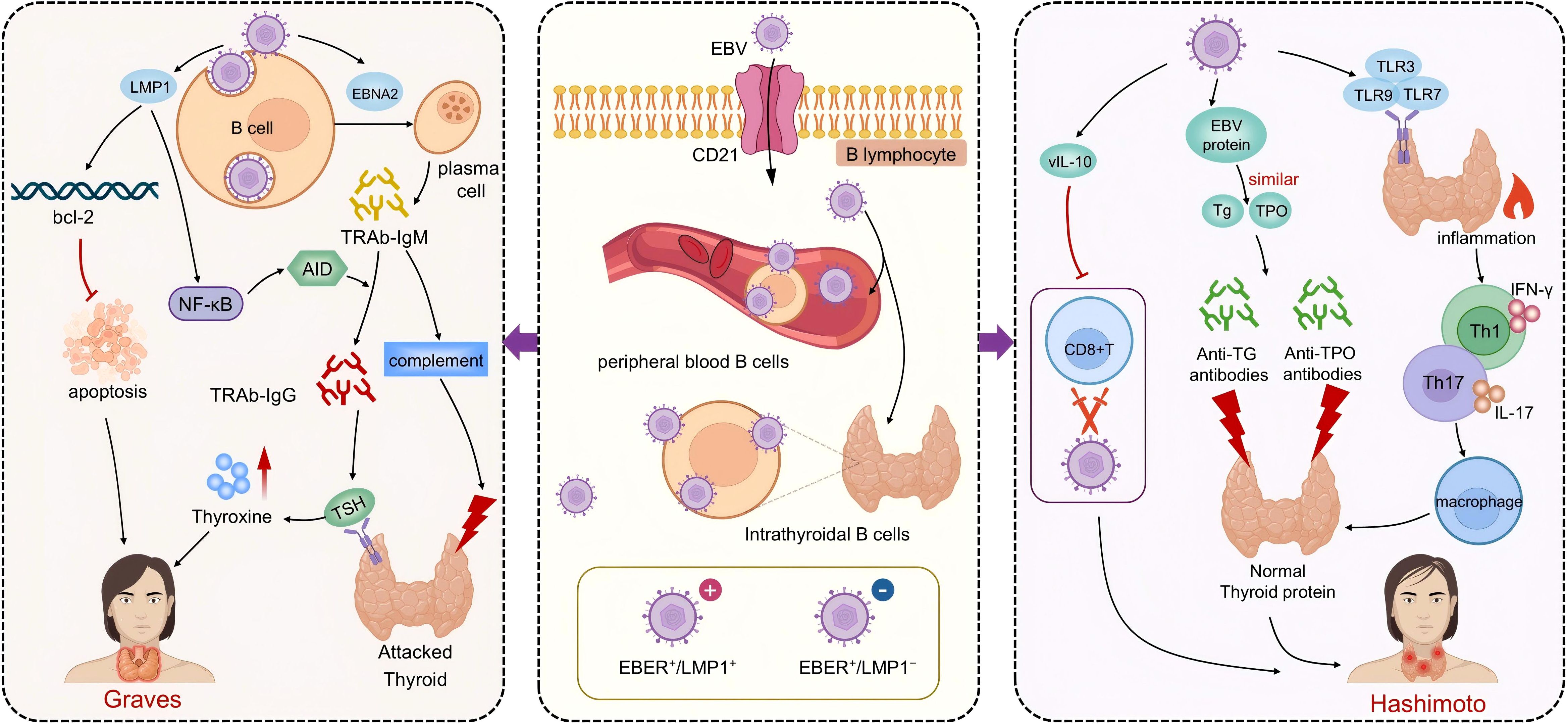 Figure 1. The pathogenic mechanisms of EBV in Graves’ disease and Hashimoto’s thyroiditis. The central portion of the figure highlights EBV infection of B lymphocytes via the CD21 receptor, with latency established both in peripheral blood and thyroid-infiltrating B cells. The left panel depicts EBV-related mechanisms in Graves’ disease (GD). EBV promotes the differentiation of B cells into TRAb-producing plasma cells. LMP1 mimics CD40 signaling, activates the NF-κB pathway, prolongs B cell survival, and facilitates class switching to generate TRAb-IgG and IgM. TRAb-IgG drives TSH receptor overstimulation and thyroid hormone overproduction, while TRAb-IgM induces complement-mediated cytotoxicity, contributing to GD pathogenesis. The right panel illustrates EBV’s role in Hashimoto’s thyroiditis (HT). Viral proteins mimic thyroid autoantigens, triggering immune cross-reactivity and production of anti-Tg and anti-TPO antibodies. EBV also activates TLR pathways, induces Th1/Th17-mediated inflammation, and secretes vIL-10 to impair CD8+ T cell–mediated clearance, sustaining chronic inflammation and thyroid dysfunction characteristic of HT.