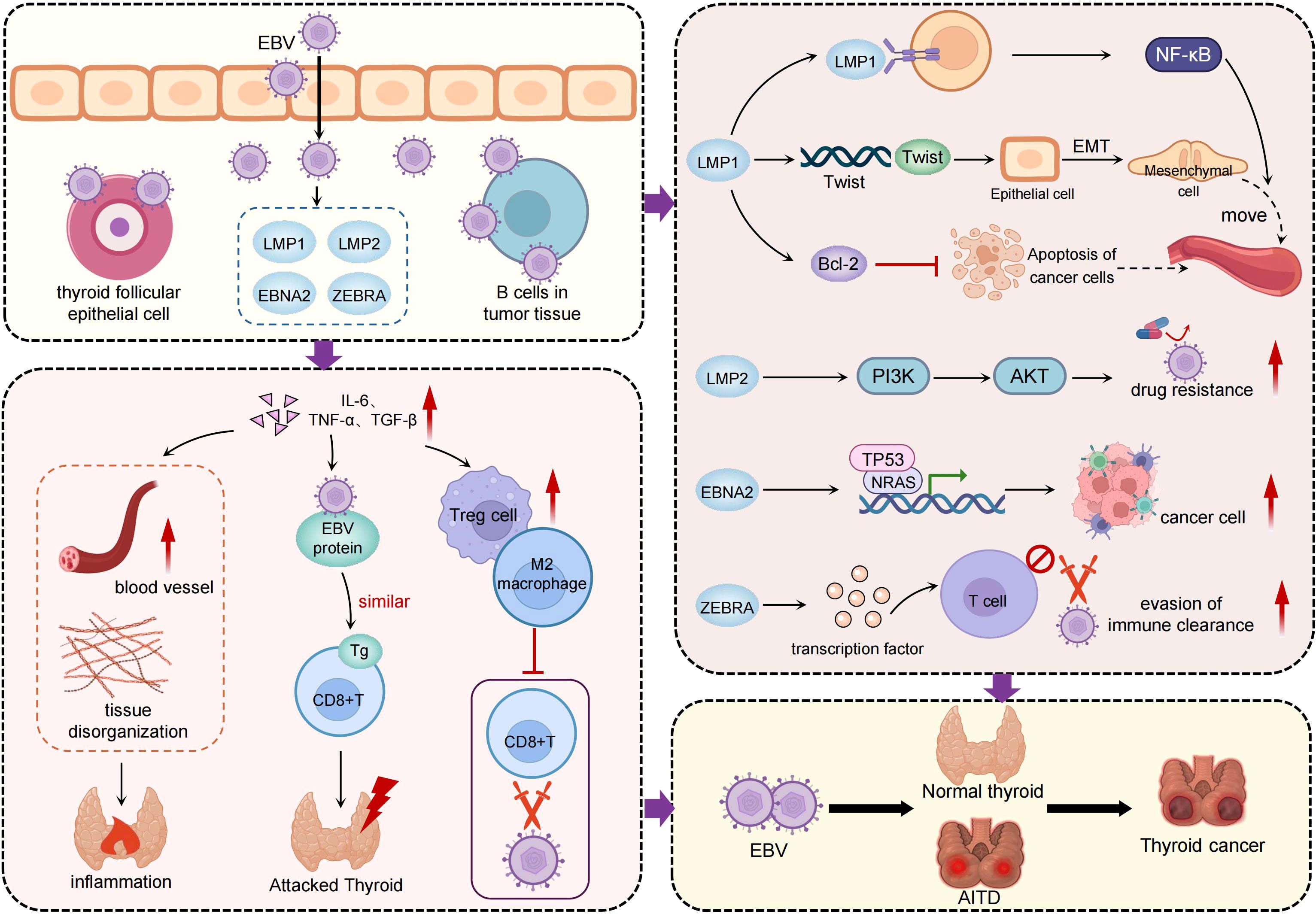 Figure 2. The pathogenic mechanisms of EBV in thyroid cancer. The central portion of the figure highlights EBV infection of thyroid follicular epithelial cells and tumor-infiltrating B cells, with high expression of viral markers such as EBER, EBNA1, LMP1, and LMP2 detected in thyroid cancer tissues. The left panel illustrates EBV-mediated remodeling of the tumor microenvironment. By inducing inflammatory cytokines such as IL-6, TNF-α, and TGF-β, EBV promotes chronic inflammation and facilitates the infiltration of regulatory T cells and M2-polarized macrophages. This immunosuppressive environment weakens host immune surveillance and contributes to tissue disorganization. The right panel depicts how EBV activates key oncogenic pathways through its latent and lytic proteins. LMP1 stimulates NF-κB signaling and upregulates Twist, driving epithelial–mesenchymal transition and enhancing tumor invasiveness. LMP2 activates the PI3K/AKT pathway, promoting cell survival and drug resistance. EBNA2 interferes with tumor suppressor genes such as TP53 and NRAS, contributing to tumor dedifferentiation. ZEBRA impairs T cell activation, facilitating immune evasion. In addition, EBV may promote the transition from autoimmune thyroid diseases to thyroid cancer, underscoring its bridging role in inflammation-driven tumorigenesis.