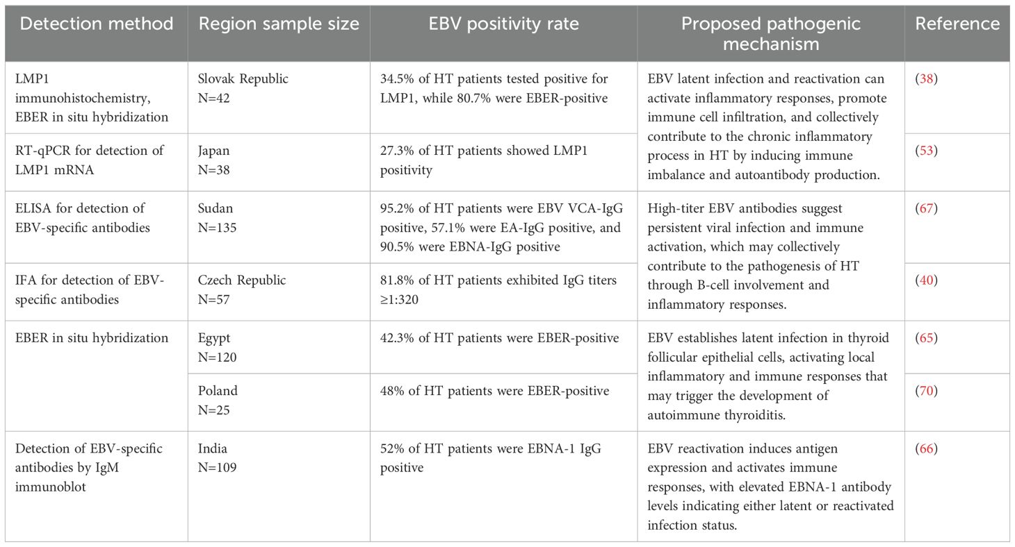 Table 2. Summary of EBV detection methods, positivity rates, and proposed pathogenic mechanisms in hashimoto’s thyroiditis.
