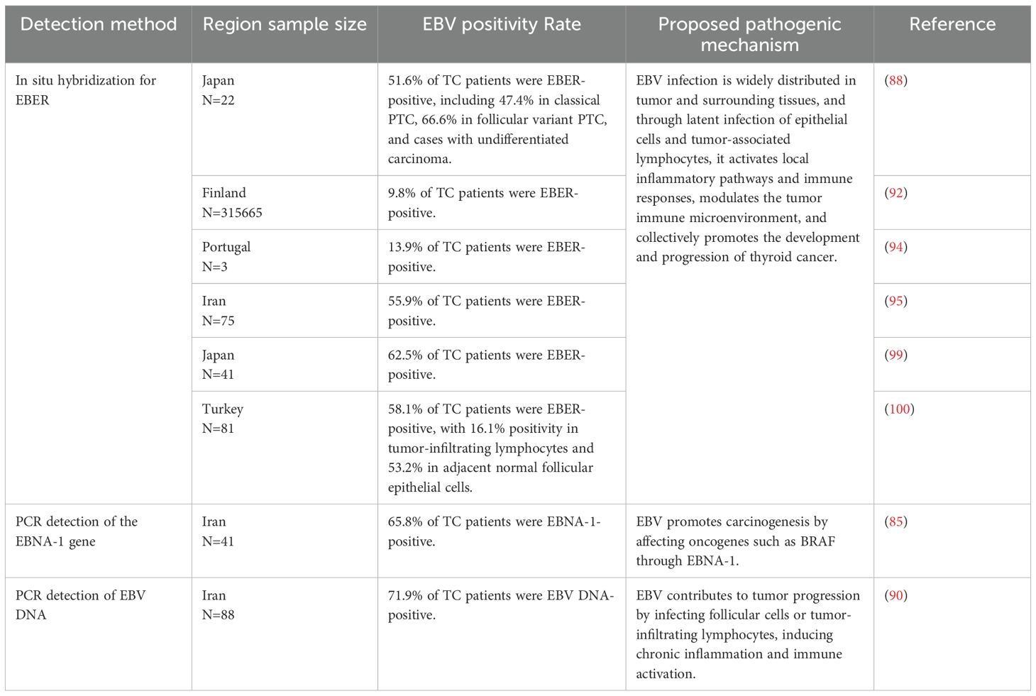 Table 3. Summary of EBV detection methods, positivity rates, and proposed pathogenic mechanisms in thyroid cancer.