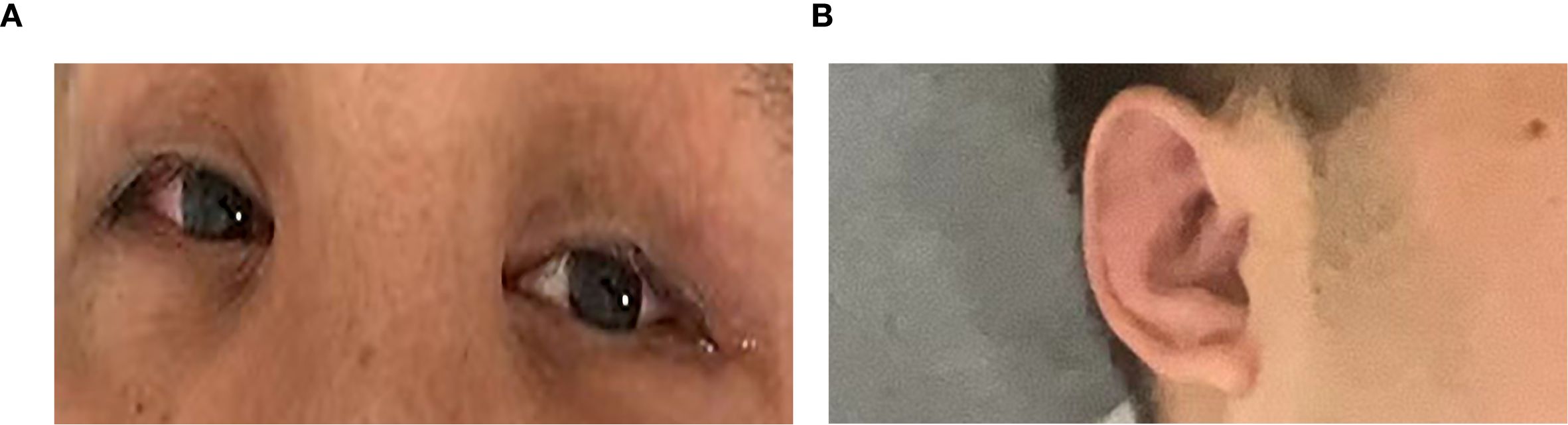 Figure 1. (A) Right scleral injection. (B) Mild auricular swelling. The most severe signs were not photographed.