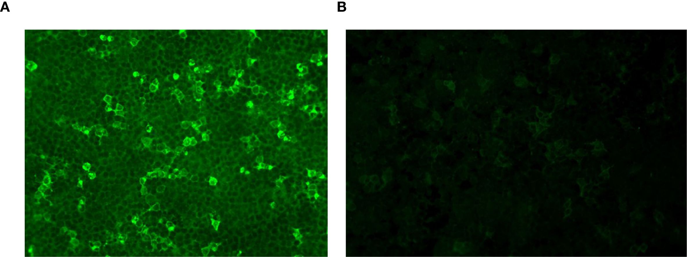 Figure 2. GABABR-expressing HEK293T cells were immunofluorescence-stained with serum and CSF. (A) Anti-GABABR IgG titer in the serum was 1:100 (×40). (B) Anti-GABABR IgG titer in the CSF was 1:1 (×40). GABABR, gamma-aminobutyric acid B receptor; CSF, cerebrospinal fluid.