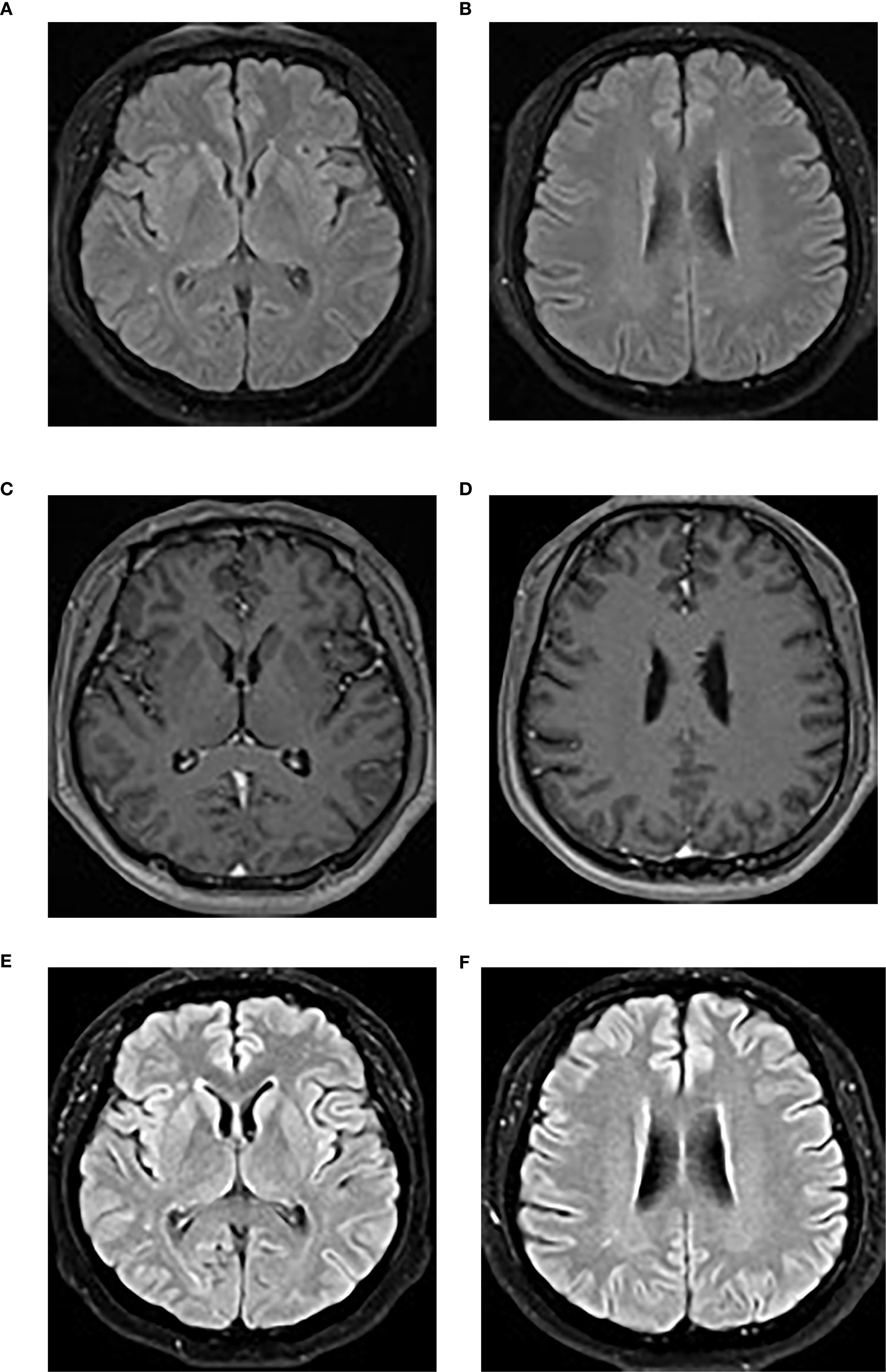 Figure 3. (A, B) The initial brain MRI image demonstrated scattered punctate T2-FLAIR hyperintensities in the bilateral frontal and parietal subcortical and periventricular regions. (C, D) Post-contrast T1-weighted imaging showed no abnormal enhancement. (E, F) A repeat brain MRI performed at the 4-month follow-up showed no significant changes on the T2-FLAIR sequence. T2-FLAIR, T2-weighted fluid-attenuated inversion recovery.